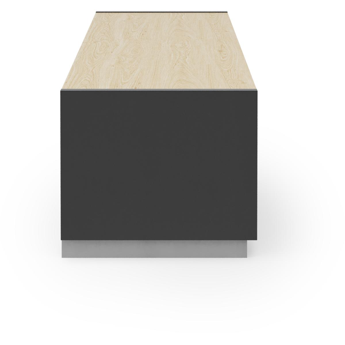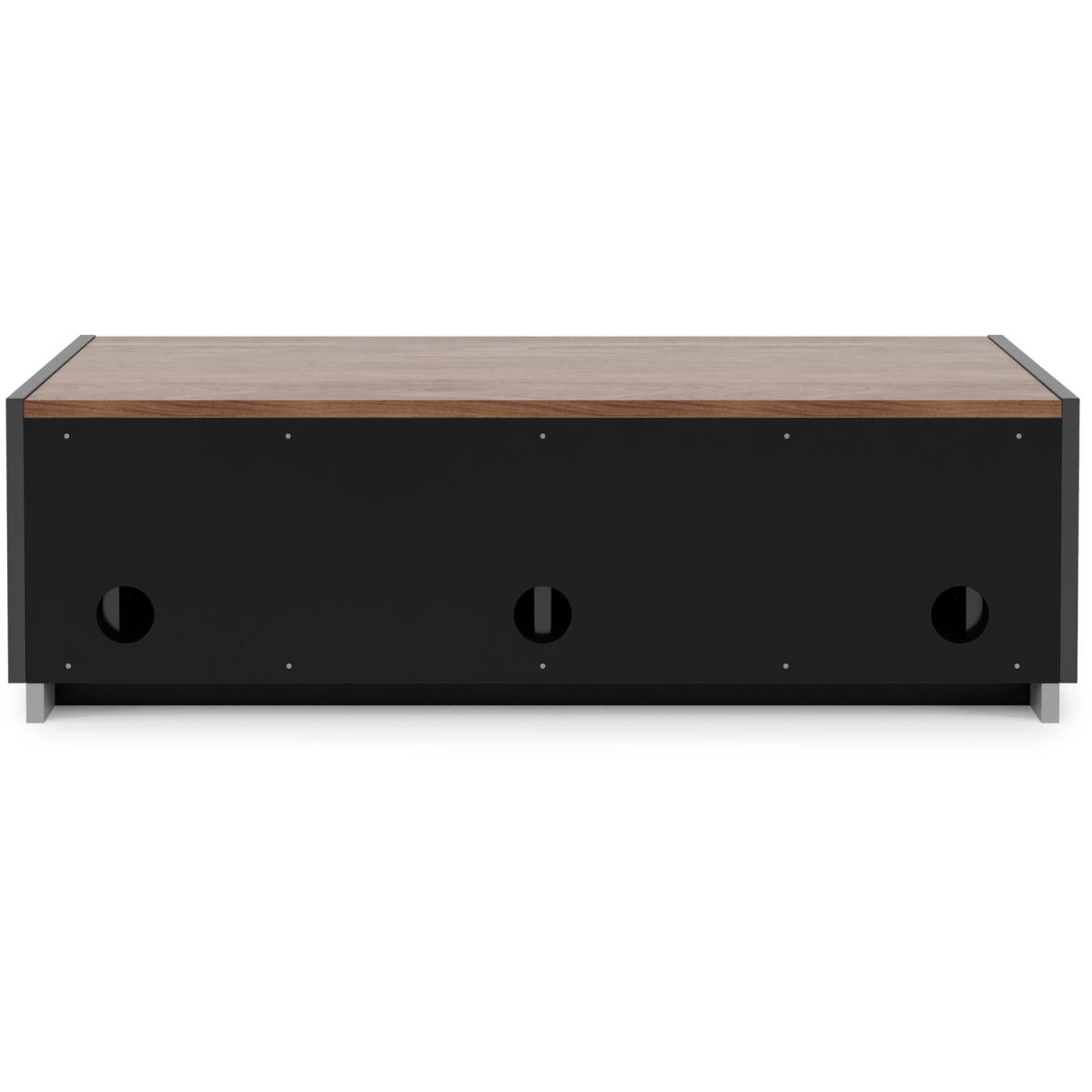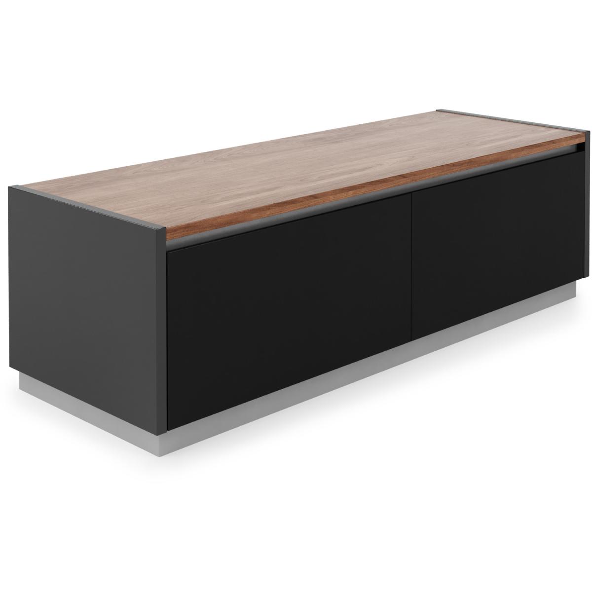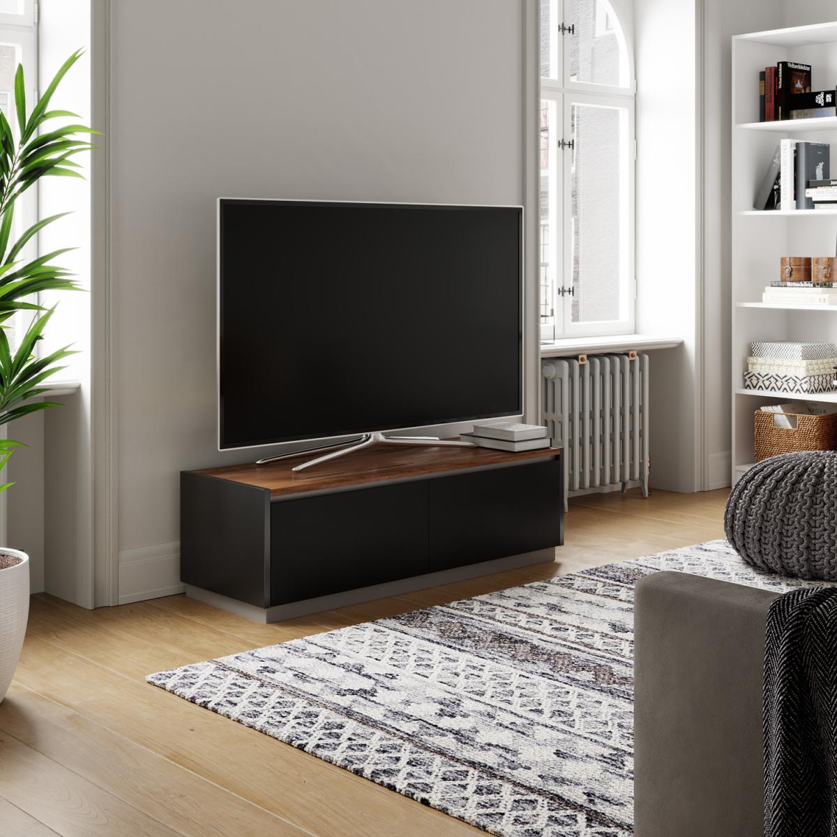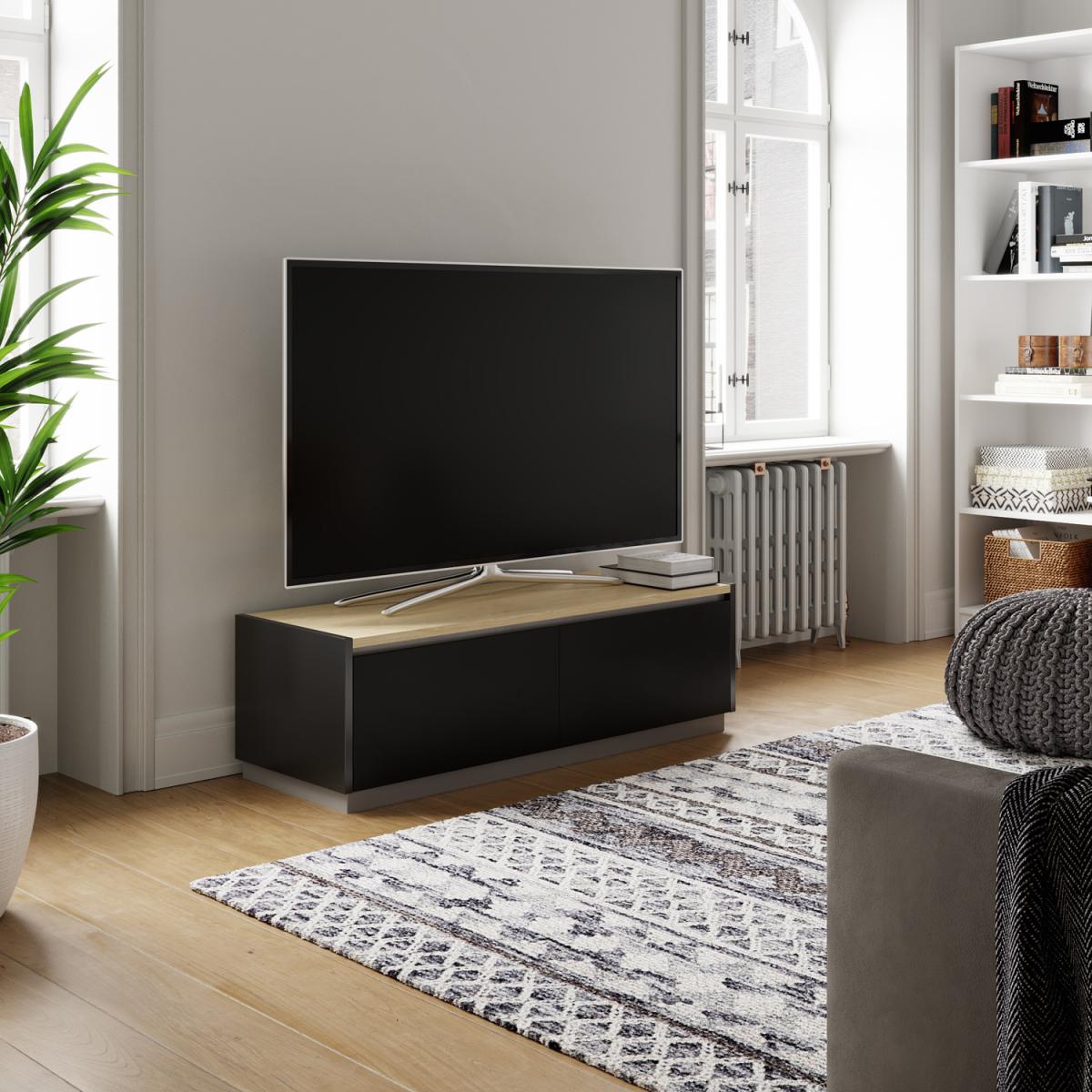 I tend to refer to this simply as the Horizon TV unit - its black carcass with a reversible oak-or-walnut top makes it a really flexible choice. The clean lines and hidden-push doors suit both contemporary Scandi schemes and pared-back industrial rooms, while the warm wood option softens the overall look. Styling-wise, keep clutter to a minimum: route any cables through the rear cut-outs and use one side for media kit, the other for small baskets or game controllers. On top, a low-profile soundbar centred beneath the screen keeps sightlines clear, and a single sculptural vase or a small potted plant at one end adds texture without overwhelming the simplicity of the unit.