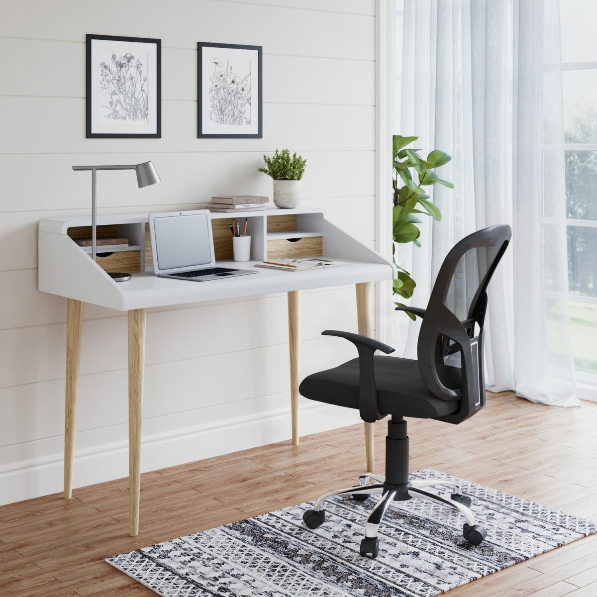 I love this chair for its sleek, modern look and ergonomic design, making it a practical choice for contemporary home offices or workspaces. Its black finish offers versatility, ensuring it blends well with both minimalist and industrial interiors, while also being easy to maintain. For styling, pair it with a glass or wood desk for a clean, professional vibe, or soften the look with colourful accessories and textured fabrics in the surrounding space. Practical tips include positioning it in areas with good lighting and ensuring it matches other office essentials to create a cohesive, functional workspace.