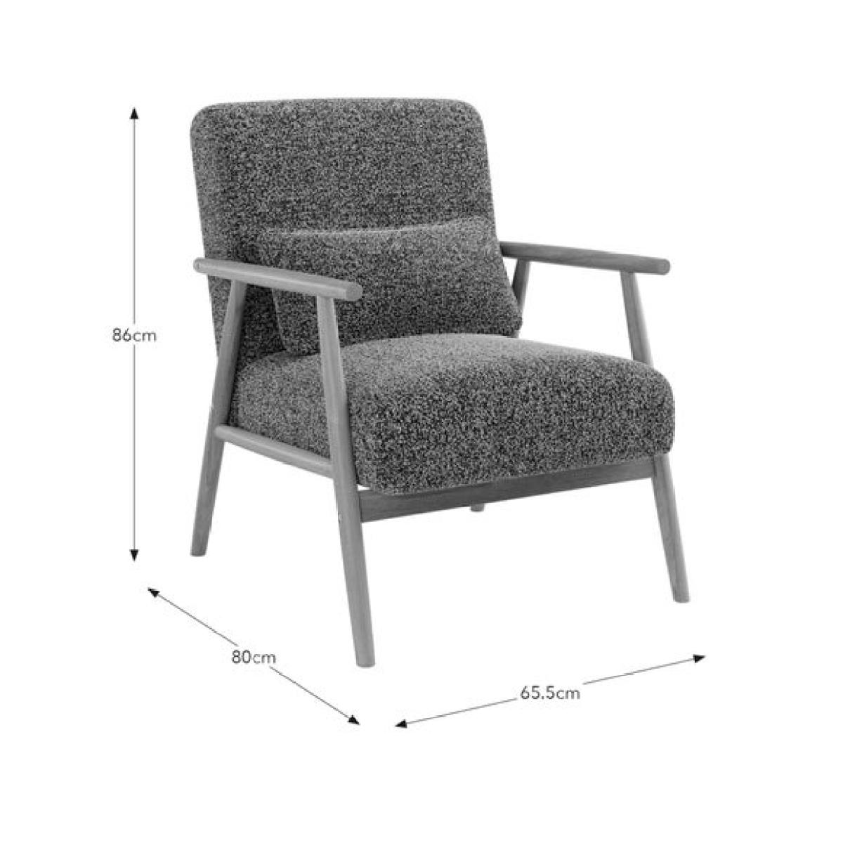 Dunelm Exclusive - Designed and Developed by Dunelm * Trendy boucle upholstery * Stylish detailing * Contemporary design * Compact size * Sturdy rubberwood legs Bold and sculptural, this chair features a striking spindle frame and a speckled black boucle fabric that adds texture and depth. The matching bolster cushion completes the look, making it a standout piece that’s as comfortable as it is stylish.