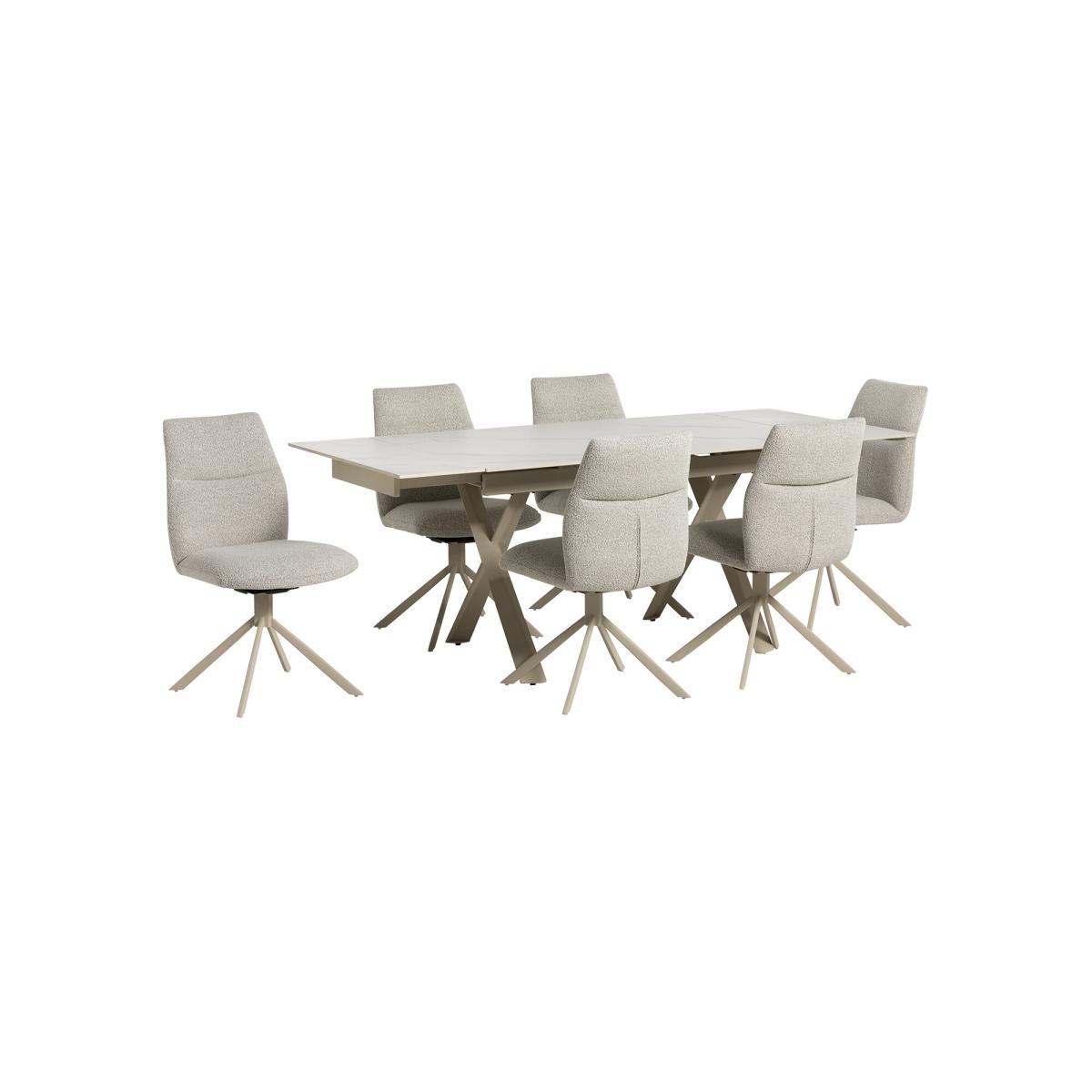 Elevate your dining experience with this beautifully designed ceramic extending dining table and six neutral swivel chairs. Perfect for modern and contemporary interiors, the sleek ceramic top combines durability with easy maintenance, while the extending function makes hosting effortless. The soft fabric swivel chairs provide comfort and flexibility, complemented by their neutral tones that blend seamlessly with any décor. Together, they create a sophisticated and functional dining setting for every occasion.