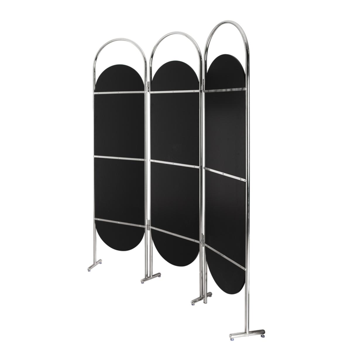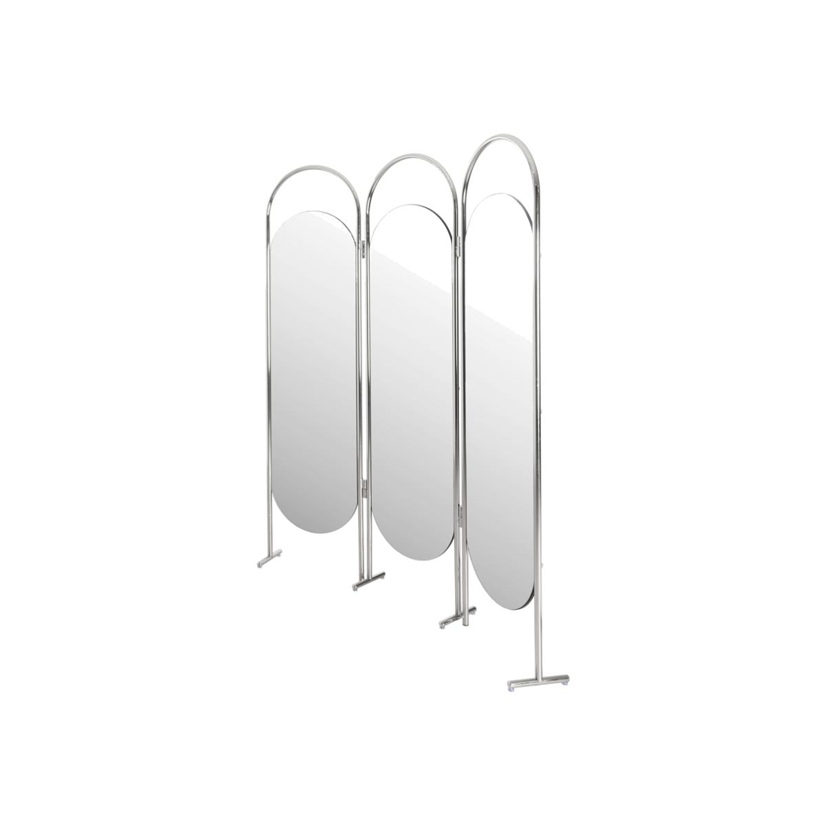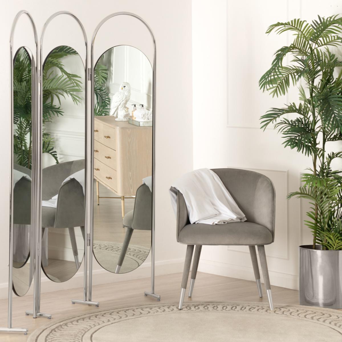 A distinctive and beautiful floor standing dressing mirror. Strong and durable toughened mirror in an art deco inspired silhouette. Steel frame detail echoing the mirror shape with a polished chrome finish. Hinge element to allow side mirrors to pivot 60 degrees. Adjustable feet. Due to the large scale of this item please ensure that it is anchored to a wall with the included tether straps to avoid toppling. Simple assembly required.