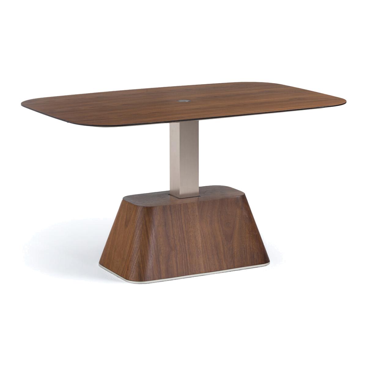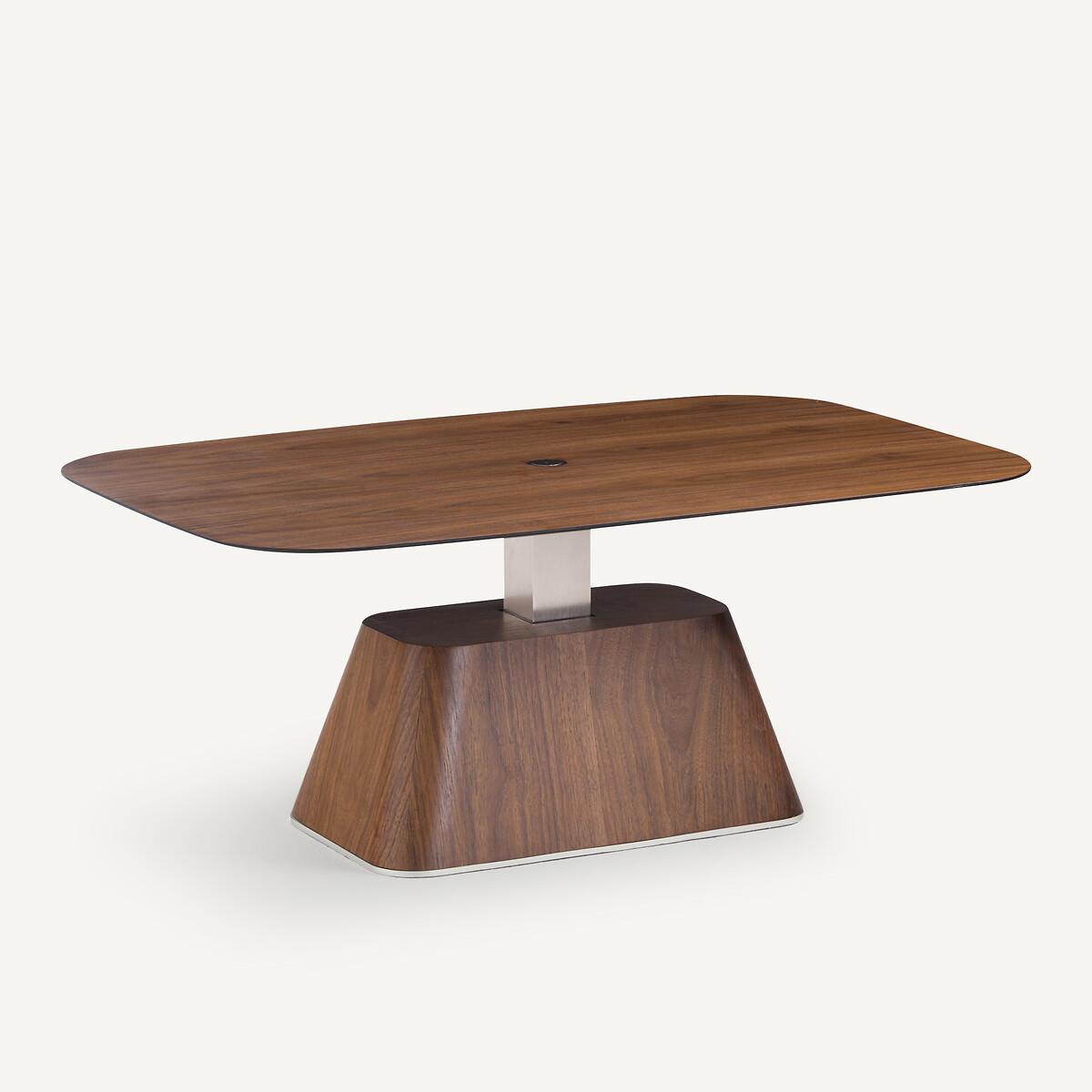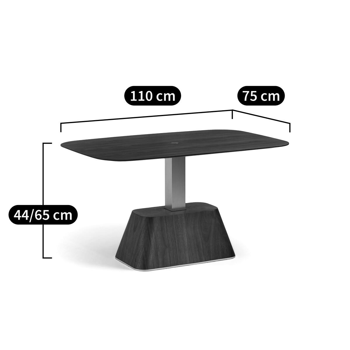 A coffee or dining table, from a sofa or an armchair... Alteza is ideal for optimising small spaces. By pressing the central button, it goes up and down from 44cm to 65cm high. Designed for 4 guests, its walnut veneer top with an organic profile rests on a solid walnut base, in which slides a mat with a satin nickel finish. An exclusive design by AMPM.Product Details • Rectangular top in FSC®-certified walnut-veneered MDF with chamfered edges, nitrocellulose varnish finish. • Central base in metal with satin nickel finish, base in solid walnut, nitrocellulose varnish finish. FSC® certified wood • Seats 4.Care Advice • We recommend the use of coasters and placemats, and to immediately wipe up any spilled liquid. Quality Info • Wood is a living material. The differences in shades, grains and knots reinforce its character and authenticity.. Over time it may crack slightly. It is a process caused by variations in temperature and humidity. Dimensions • Length: 110cm • Width: 75cm • Height: 44/65cmDelivery:. This product is sold ready to assemble. It will be delivered to your door. Note! Please check that all access points are large enough to accommodate your delivery (doors, stairs, lifts). • WOOD FROM SUSTAINABLY MANAGED FORESTS. FSC® certified wood comes from forests that are environmentally, socially and economically well managed. Dimensions and weight of parcel • 2 parcels • L69 x D45 x H49cm, 47kg • L120 x D84 x H80cm, 15kg
