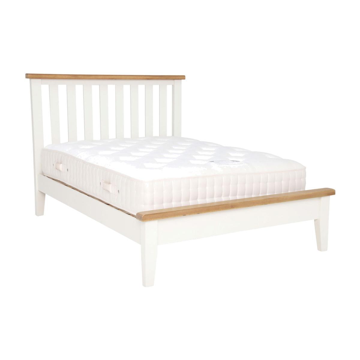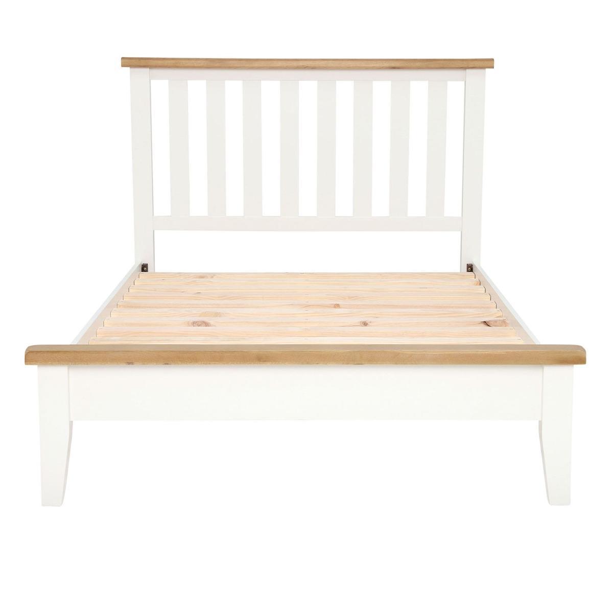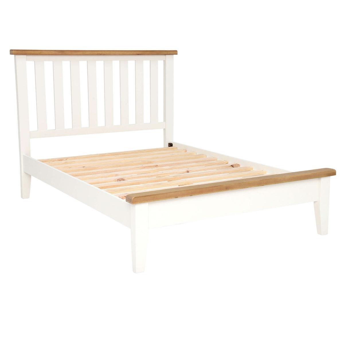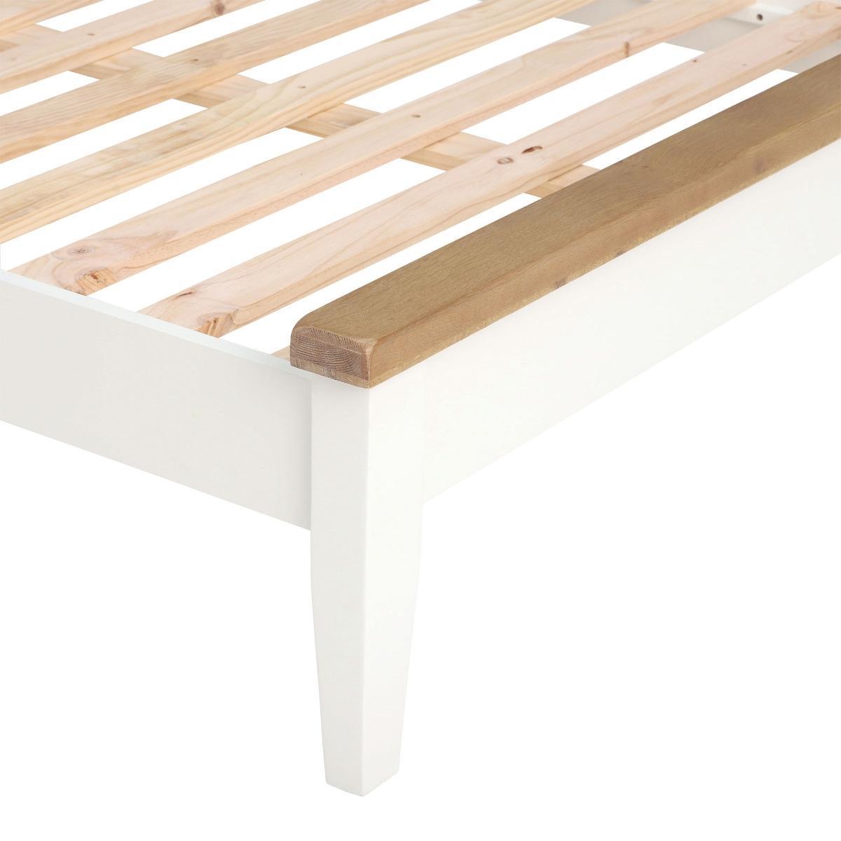 Design. With its classic detailing and light, fresh look, the Althorp bed frame will uplift any bedroom in an instant. Its contemporary white finish is enhanced by contrasting oak tops, bringing together traditional influence and modern design. The slatted headboard provides a sense of openness, echoed in the raised base which offers space for storage beneath it. Suitable for a wide range of bedroom styles, the double bed can be easily paired with our coordinating Althorp pieces.