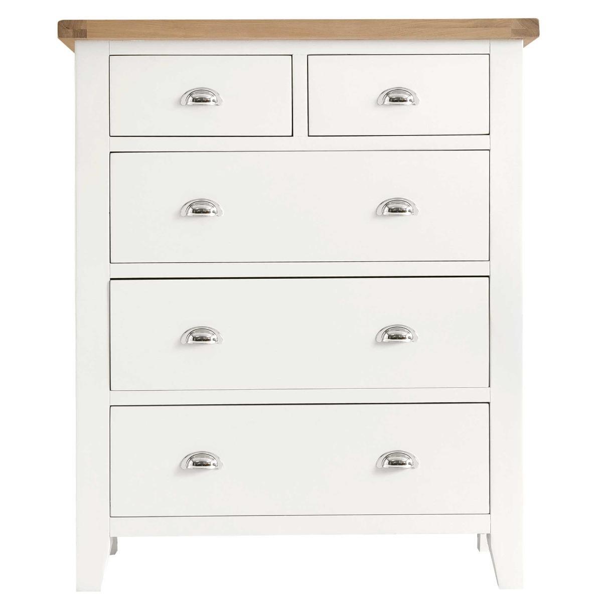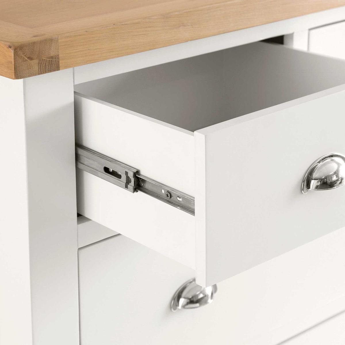 Design. The Althorp Jumbo 2 Over 3 Chest has a classic design that would still fit well in a more modern interior setting. The old white colouring and washed oak top gives the chest a nod to a traditional farmhouse look, with chrome metal cup handles to bring the piece up to date. With three full length drawers and two smaller at the top, there is plenty of storage space to keep your bedroom tidy and organised. You can also find the Althorp Full Hanging Wardrobe for more storage options.
