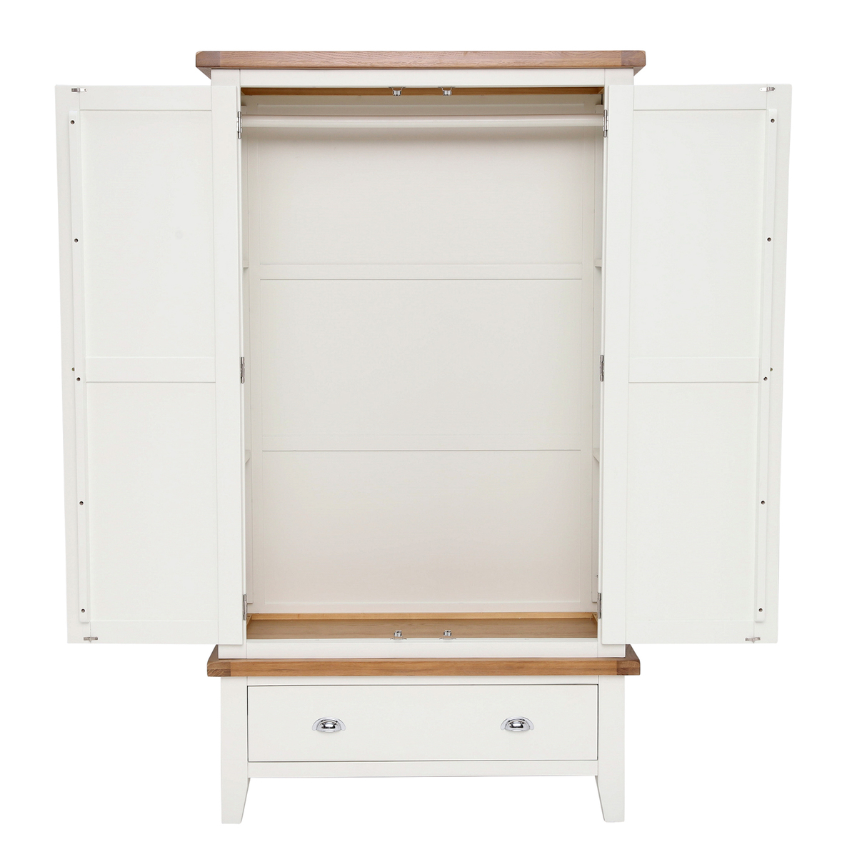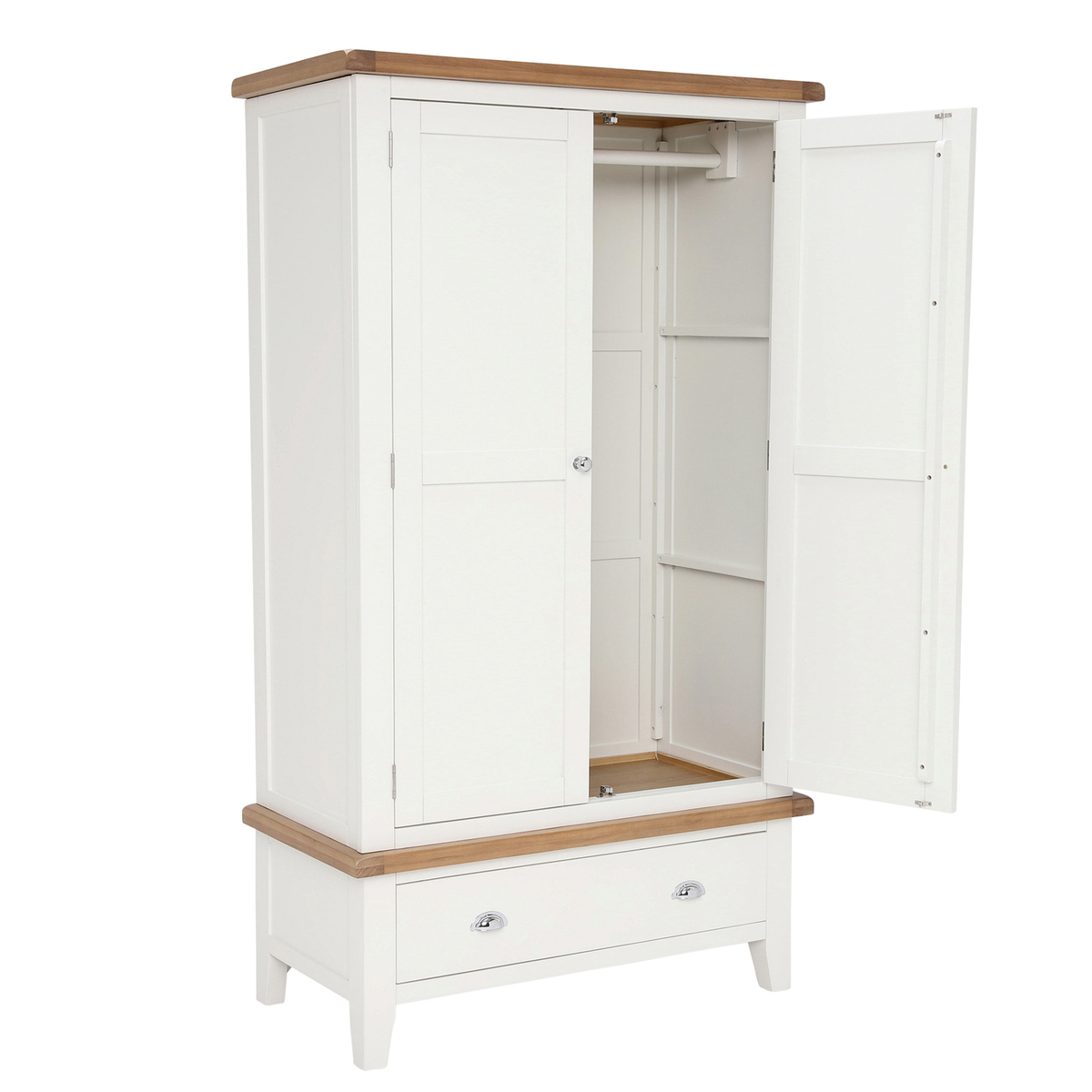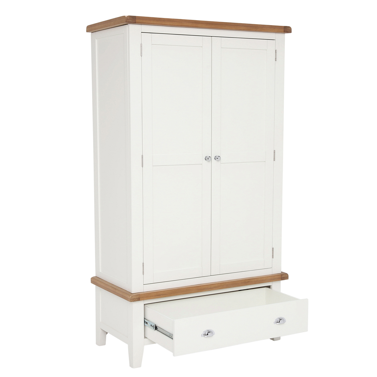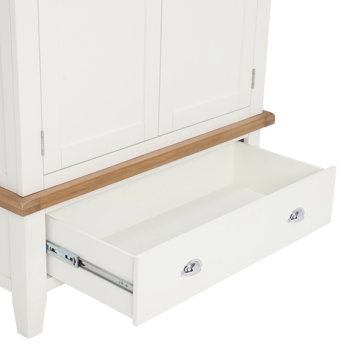For a storage solution as stylish as the clothing collection inside, look no further than the Althorp large 2 door wardrobe. Featuring a white painted finish with traditional oak accents, it is both contemporary and classic at once. Chrome handles give a fresh feel, whilst corniced detailing provides definition.;Maximising the space inside, the double wardrobe doors conceal a full hanging compartment perfect for suits and dresses, whilst the handy drawer beneath can hold folded items like pyjamas and leisurewear.;A gorgeous piece of furniture that will see you through the years, it looks twice as stunning as part of the full Althorp bedroom range.