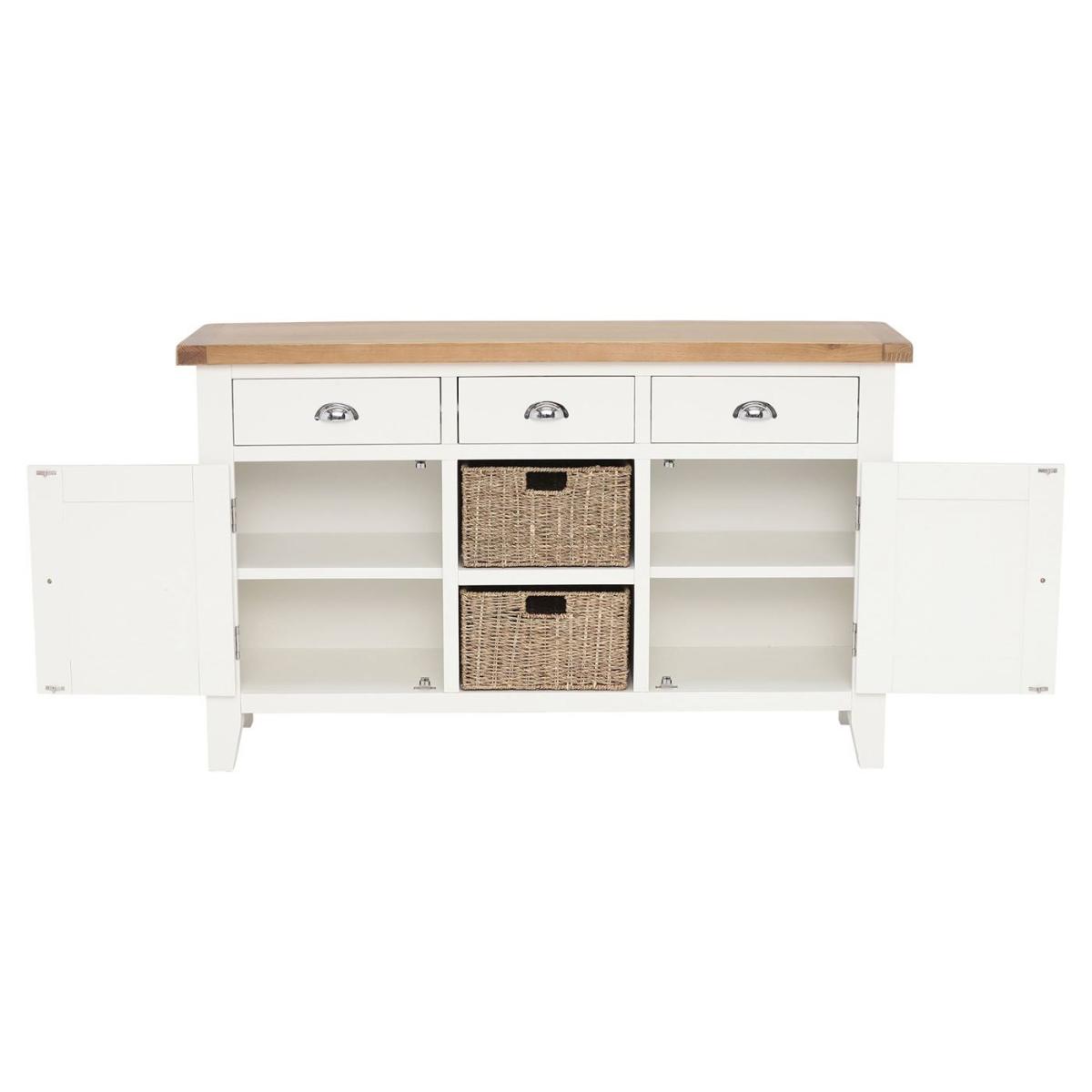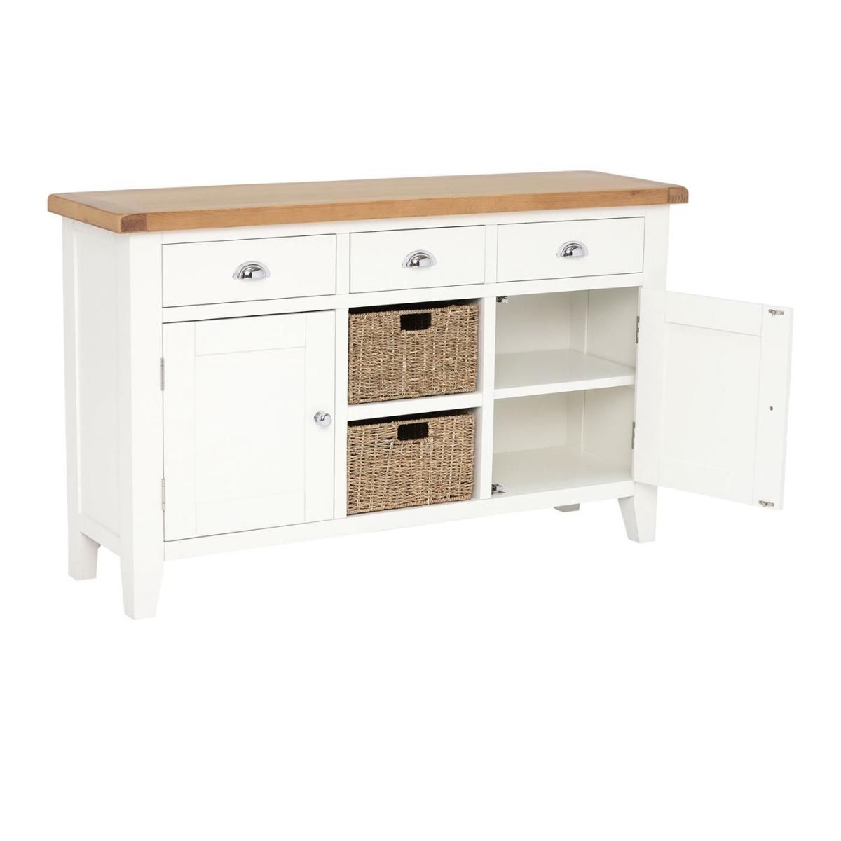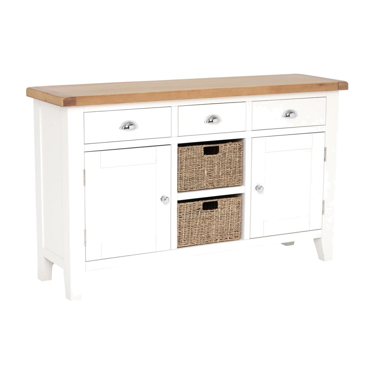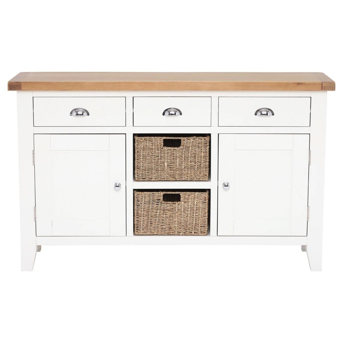 Design. With its charming aesthetic and versatile colour palette, the Althorp large sideboard sits well within a wide range of interior styles. Dressed in a contemporary white finish and detailed with chrome handles, it has a clean and light look that refreshes any room in an instant. The natural oak top is a gorgeous finishing touch. An absolute storage essential, the sideboard features three drawers, two cupboards and two rustic wicker baskets to ensure there’s a tidy place for all of your dining accessories.