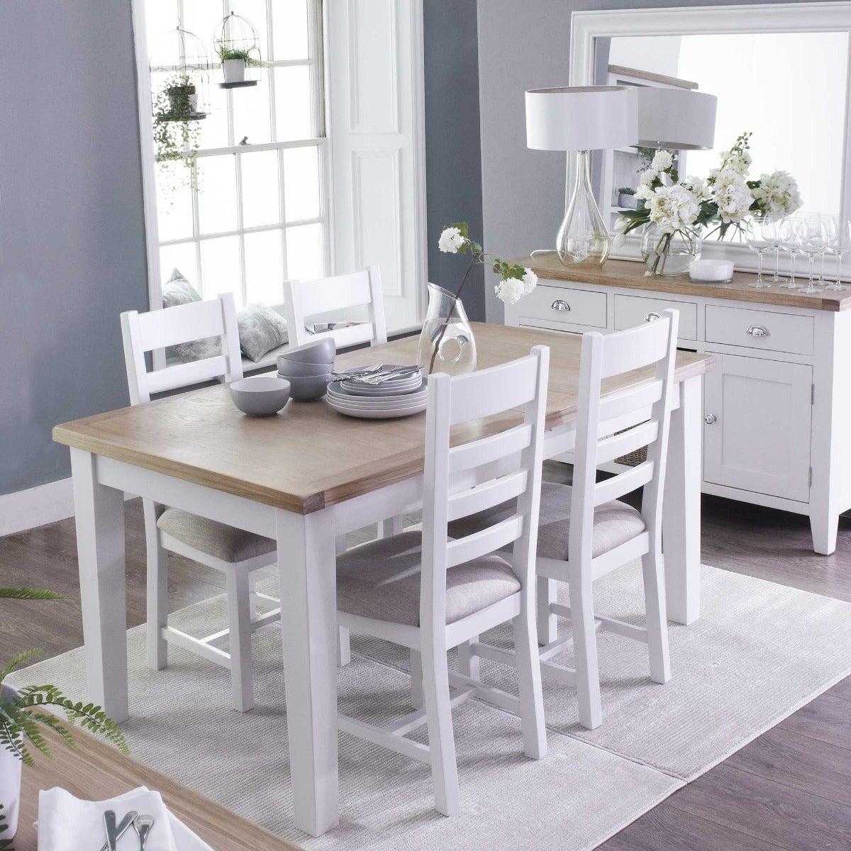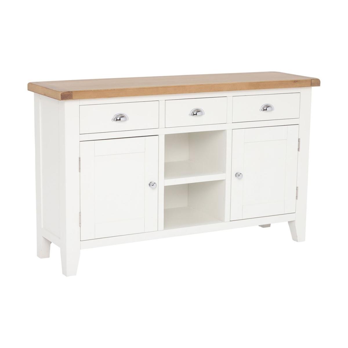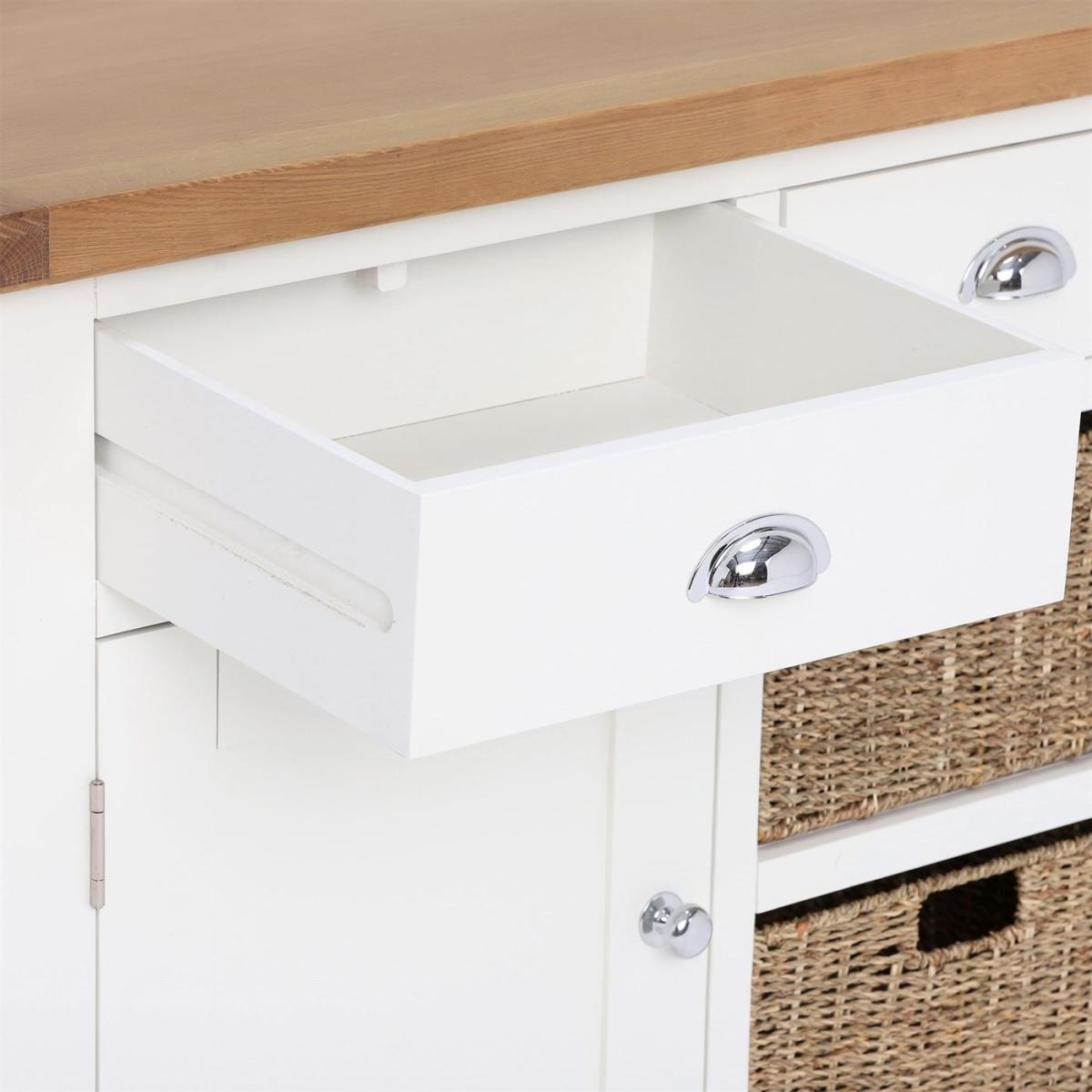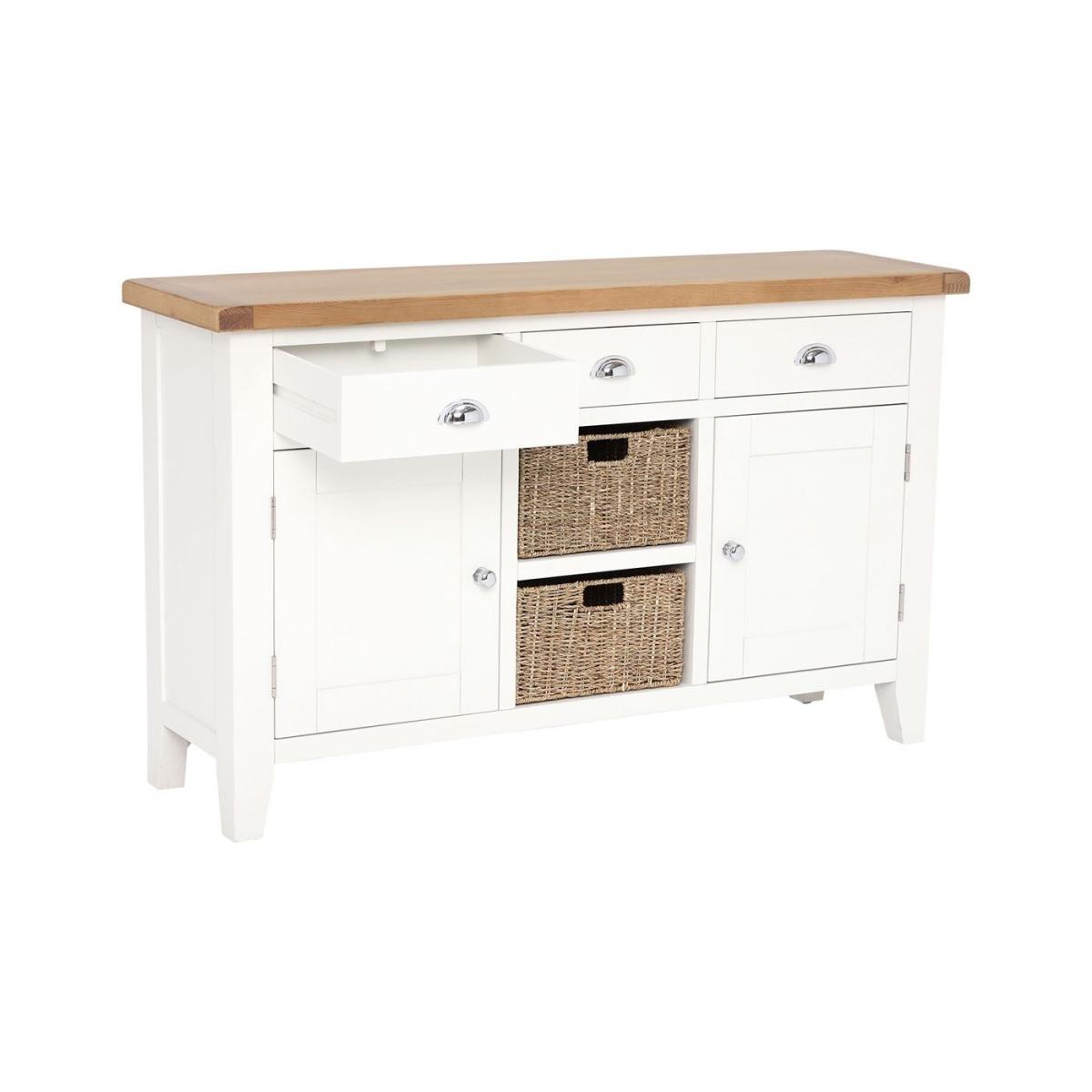 Design. With its charming aesthetic and versatile colour palette, the Althorp large sideboard sits well within a wide range of interior styles. Dressed in a contemporary white finish and detailed with chrome handles, it has a clean and light look that refreshes any room in an instant. The natural oak top is a gorgeous finishing touch. An absolute storage essential, the sideboard features three drawers, two cupboards and two rustic wicker baskets to ensure there’s a tidy place for all of your dining accessories.