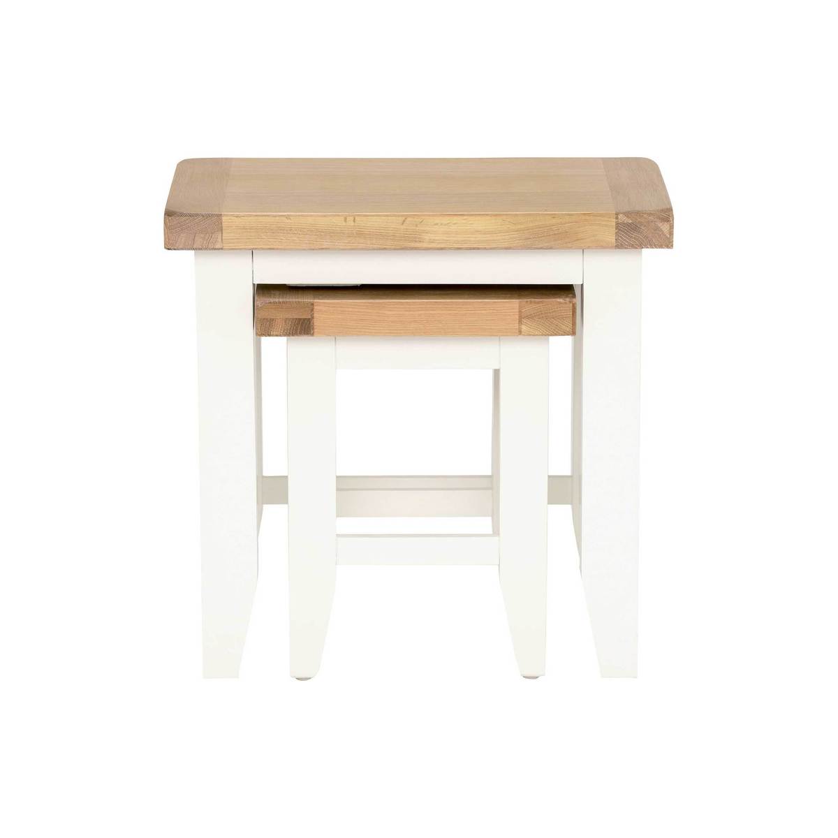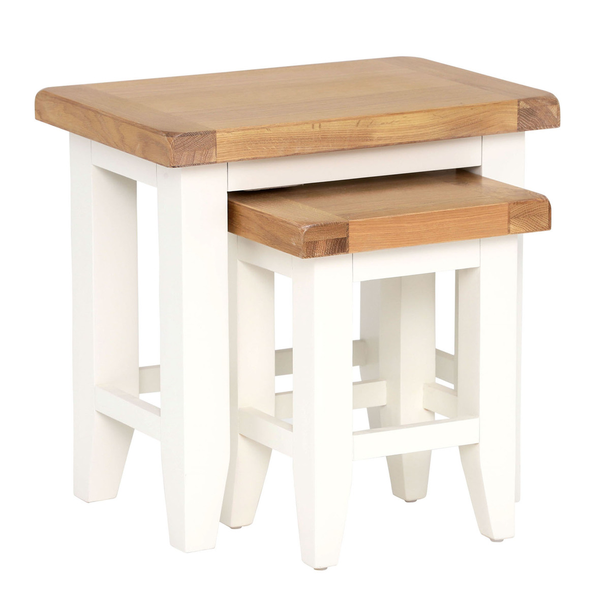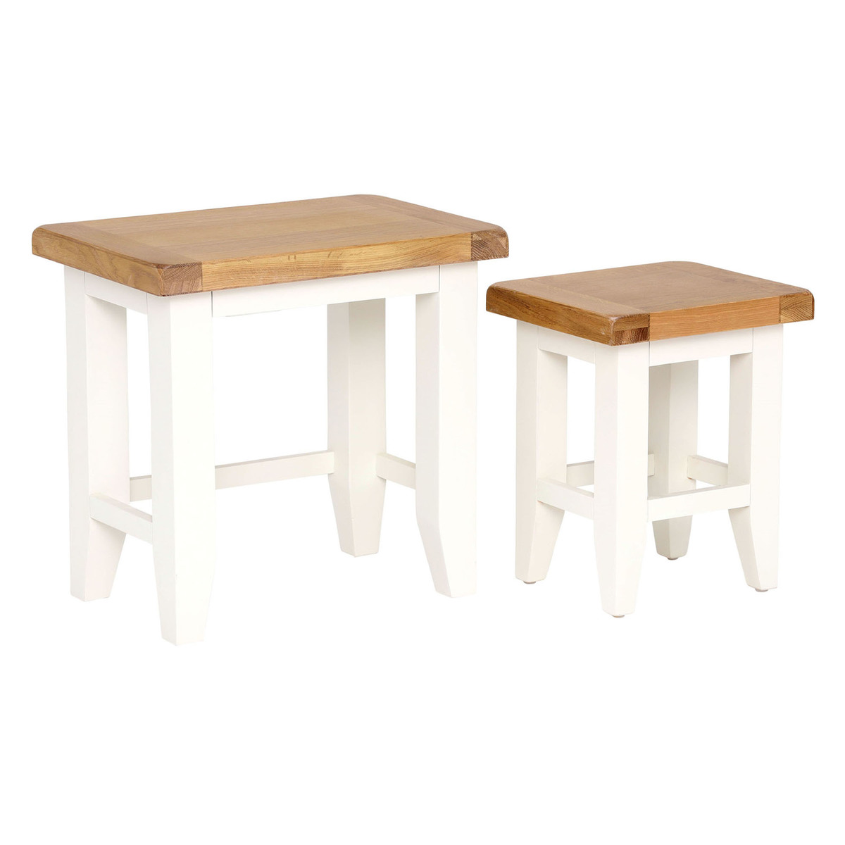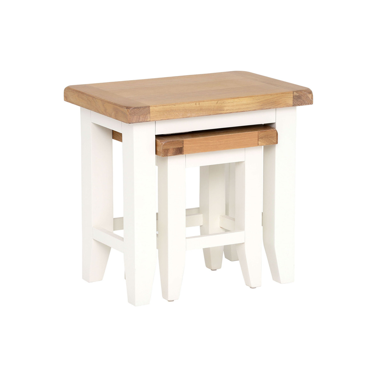 A stunning style feature as well as a space-saving solution, the Althorp nest of 2 tables gives you the practicality of two side tables without taking up the square-footage. Dressed up with accessories when not in use, they make a subtle statement with their crisp white finishes and warm oak tops. The smaller table can be brought out to hold a cup of tea or two when visitors stop by, then seamlessly slotted away beneath the larger one. Combine with other pieces from the Althorp range for a smart, cohesive look.
