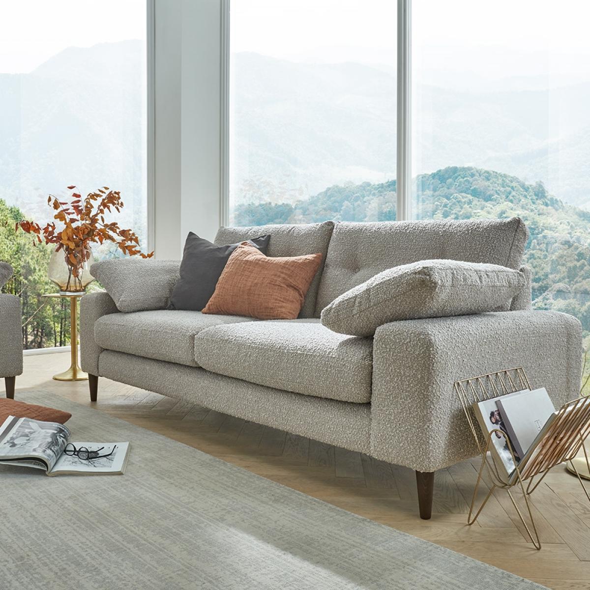 The perfect setup for movie marathons and binge-watching boxsets; snuggle into the oh-so comfortable Alto 3 Seater Sofa. Cosy, comfortable and hand-crafted with care in the UK, the Alto collection is one of a kind! Pairing low box arms with buttoned back cushions, added bolsters and deep fibre filled seats; settle in with a selection of snacks and take all the time you need. Not just for sitting in front of the box, delve into a book or enjoy coffee catchups in comfort. With enough space for three of you to spread out; add the coordinating Alto sofas, armchairs and footstools if you need more seating! Each piece features classic, tapered cone feet with a rich walnut stain. Style your set in a choice of upholstered fabrics - will you go for deep velvet hues or sophisticated light linens? If you're feeling daring, mix and match materials and tones to make a big statement in your living room!.