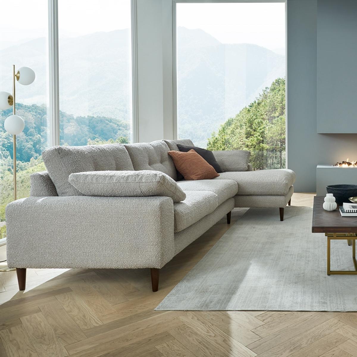 Handcrafted in the UK and made for stretching out - the Alto Right Hand Facing Chaise Sofa is snug and supportive. The L shaped sofa benefits from an added chaise longue so you can pop your feet up while you've got your nose in a book or you're fixated on your favourite TV shows. Settle into the deep seats, foam and fibre filled cushions and added bolsters to give your body a break while you unwind! Styled with buttoned accents, tapered walnut stained feet and box arms - the traditional and contemporary details would suit any interior style. Compliment your home with your choice of upholstery. From luxuriously soft, recycled velvets to textured bouclé - in a selection of striking and sophisticated colourways, you could even use your new sofa as inspiration to completely update your living room. Also available as a left hand chaise sofa; pair with the other pieces from the Alto collection and create the configuration to suit your living space.