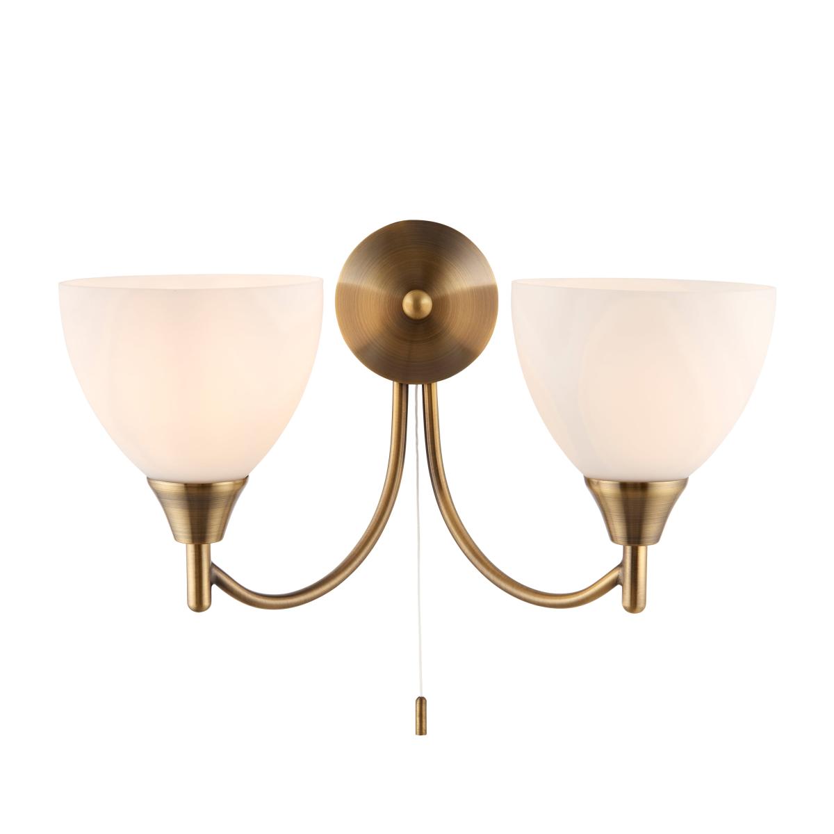 A twin wall light with an antique brass and opal glass finish; both dimmable and suitable for use with LED lamps. Matching items available in this range, and it also comes in satin chrome.