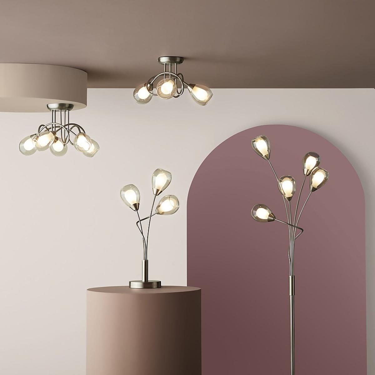 Our Altringham lighting family comprises 3 and 5 light semi flush ceiling lights, a 3 light table lamp and a 5 light floor lamp. All finished in satin nickel with stylish clear & frosted glass shades. A style perfect for any home setting.
