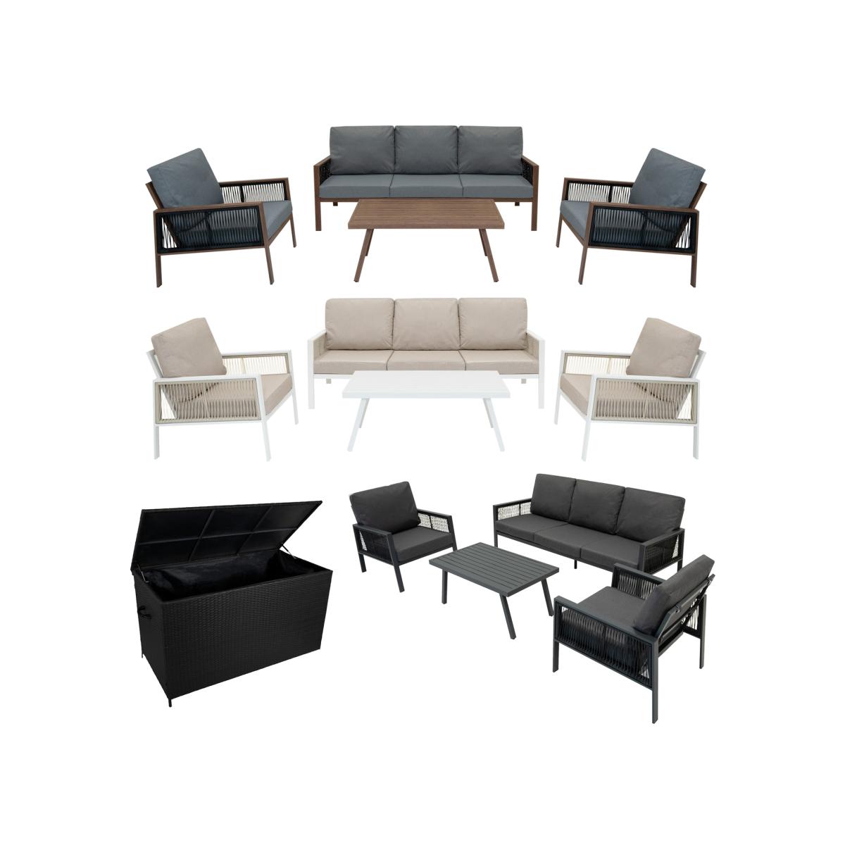 The 4 piece aluminium sofa set delivers a timeless blend of comfort and contemporary elegance Featuring a generously sized three seater sofa two deep cushioned armchairs and a coordinating coffee table it offers ample space for hosting friends or enjoying peaceful moments outdoors The striking anthracite grey finish adds a modern look while the clean lines and neutral tones ensure seamless integration with any garden or patio aesthetic Whether its your morning coffee spot or the hub of a summer gathering this set creates a sophisticated and inviting atmosphere. Built from high quality powder coated aluminium the set is lightweight yet robust designed to withstand the unpredictable British weather without sacrificing appearance The included rain cover keeps everything protected and looking its best year round while the plush cushions provide supreme comfort Each cushion cover is easily removable and hand washable making maintenance simple and stress free The matching coffee table provides a practical space for drinks books or decor completing the perfect setting for leisurely outdoor living. To complement this elegant furniture set the black rattan garden storage box adds a smart and stylish storage solution to your outdoor area Constructed from durable powder coated steel and finished in a UV resistant black rattan weave this storage box not only looks great but is built to last With a spacious capacity it comfortably houses all your garden cushions and accessories protecting them from the weather thanks to its waterproof interior lining.