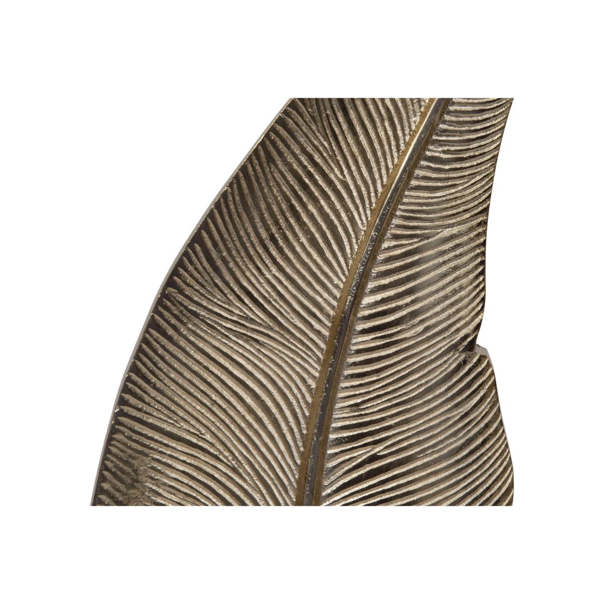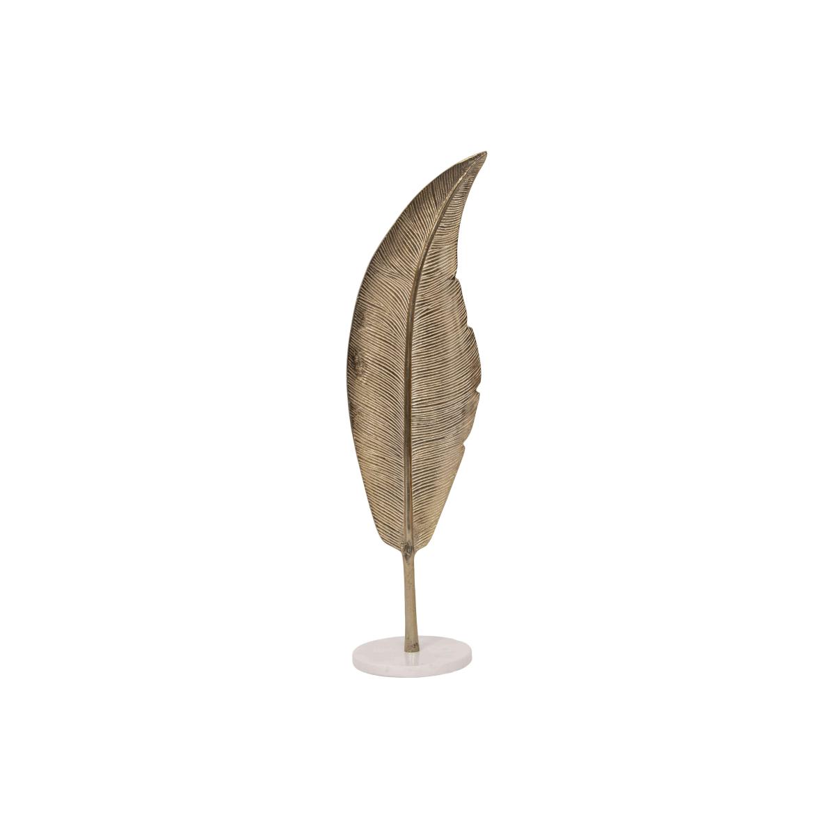 The Aluminium feather leaf sculpture captures freedom and elegance with its feather design that’s held aloft in the air as if in motion. The ideal modern sculpture for any art lover's home. Why you'll love it. Modern sculpture finished in beautiful champagne gold. A contemporary yet traditional organic shape. Rests on a solid white marble base. A Furniture Village exclusive. What you need to know. Handmade from sand-casted textured aluminium. Dimensions. Height: 50 cm (20 in). Width: 15 cm (6 in).