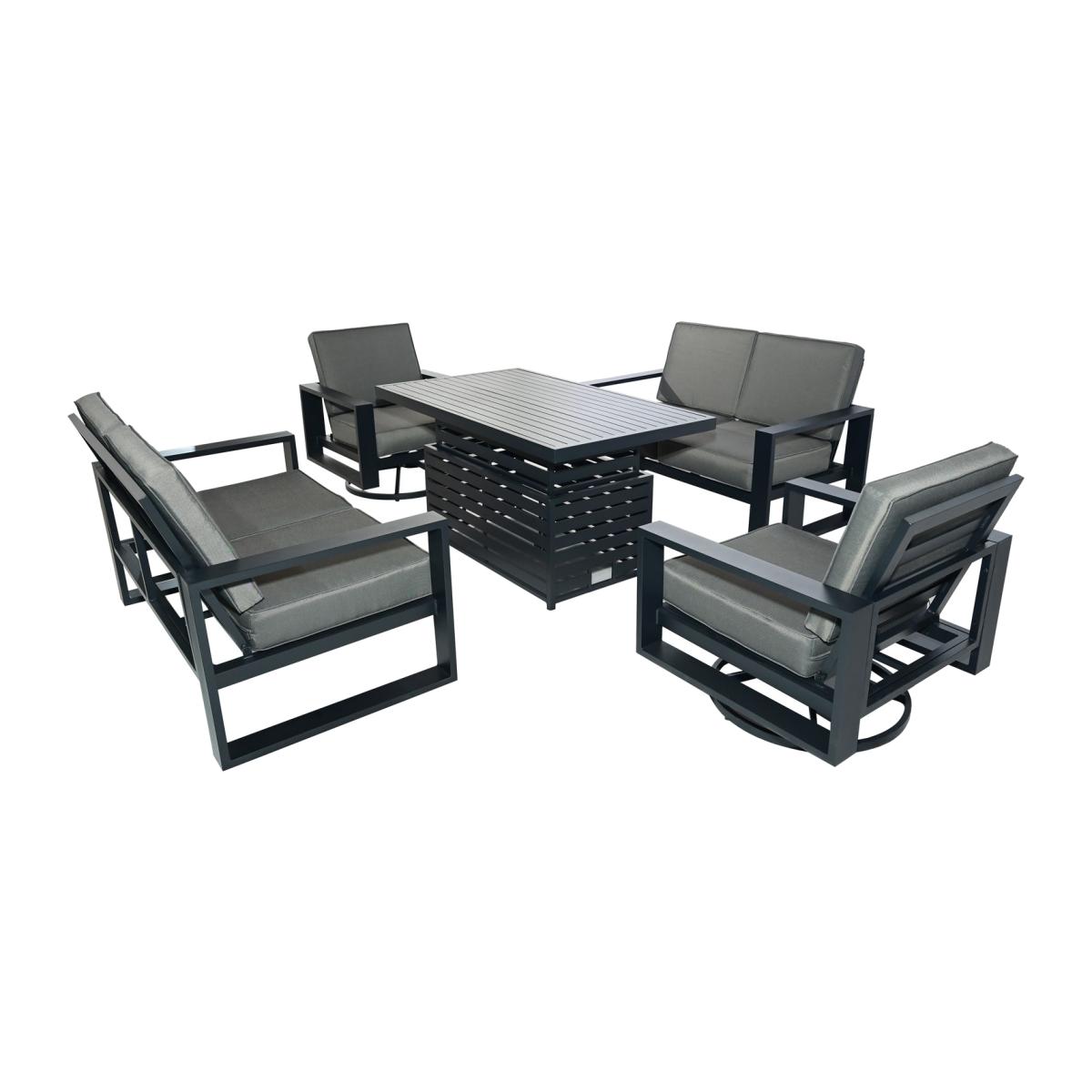 Create an elegant backyard and entertaining space with the Patio Aluminum Sofa by Furniture One ! This collection offers the perfect blend of streamlined, minimalist seating and luxuriously comfortable deep seating. All of the same comfort with none of the maintenance! Durable aluminium frames and all-weather seat padding are made to endure in any outdoor setting, rain or shine. It's a beautiful addition whether in your garden, patio, porch, poolside, or other outdoor space! Aluminium Garden Sofa with Height-Adjustable Table Furniture Set - Grey / 1 Height-Adjustable Table, 2 Swivel Chair, 2 Loveseat