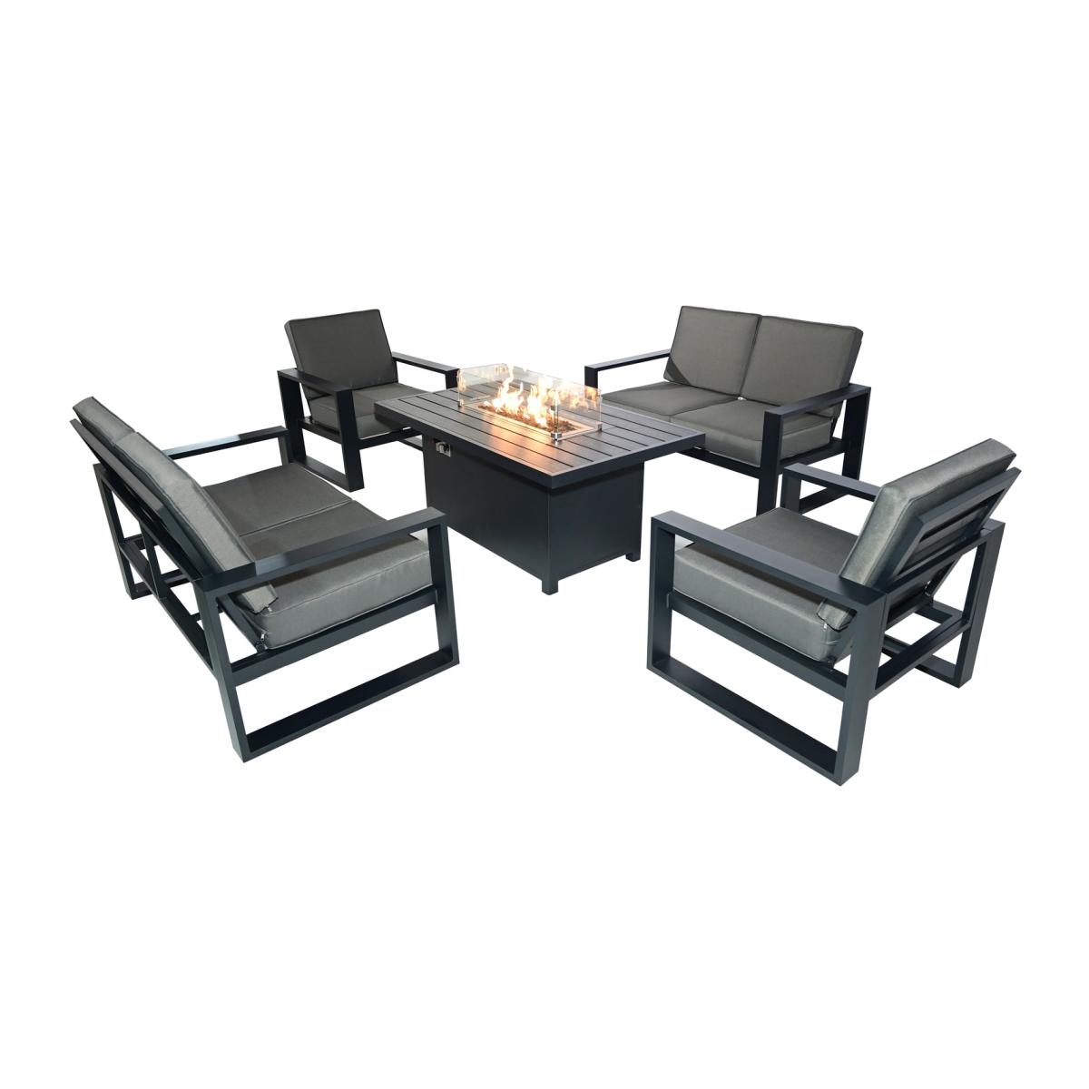 Create an elegant backyard and entertaining space with the Patio Aluminum Sofa by Furniture One! This collection offers the perfect blend of streamlined, minimalist seating and luxuriously comfortable deep seating. All of the same comfort with none of the maintenance! Durable aluminium frames and all-weather seat padding are made to endure in any outdoor setting, rain or shine. It's a beautiful addition whether in your garden, patio, porch, poolside, or other outdoor space! Aluminium Garden Sofa with Large Fire Pit Table Furniture Set - Grey / 1 Fire Pit Table, 2 Armchairs, 2 Loveseats