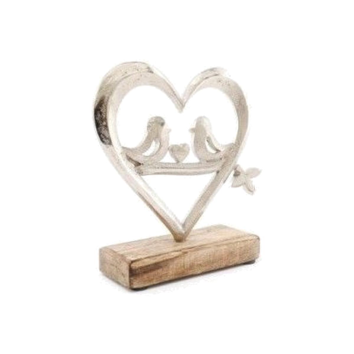 Aluminium Heart and Bird On Wooden Base - Silver