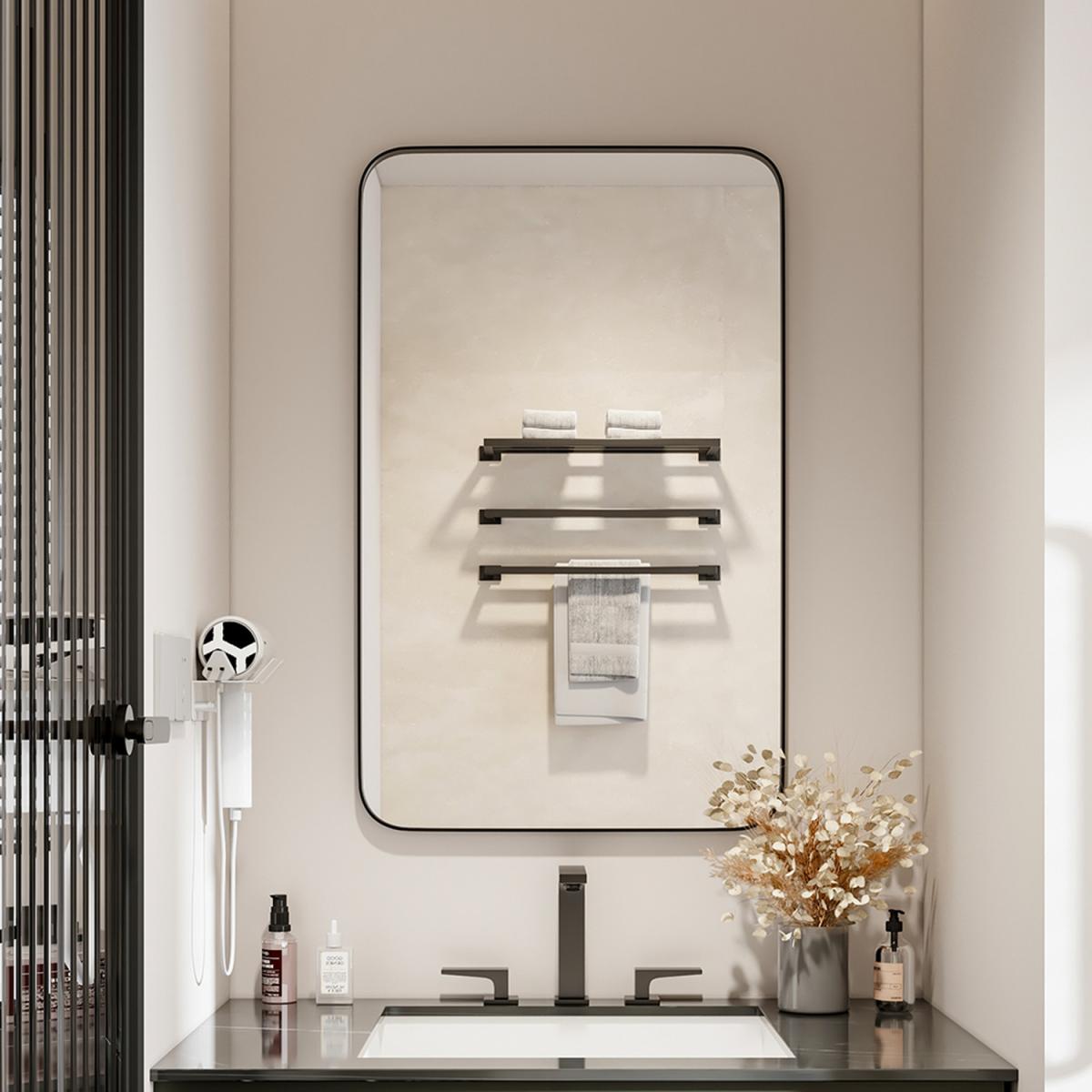 I love the clean, modern look of this large black-framed mirror, which makes it a versatile addition to various bathroom styles. Its sleek aluminium frame adds a contemporary edge, perfect for minimalist or industrial interiors, but it can also work well in more eclectic or Scandinavian schemes when paired with light woods and neutral tones. Practical styling tips include layering with lighting, such as wall-mounted sconces, to enhance the mirror’s reflection and brighten the space. Also, positioning it above a vanity with simple, functional accessories keeps the focus on the mirror’s bold shape, while smaller coordinating black accents can create a cohesive look. Overall, it’s an smart choice for making a bathroom appear more spacious and stylish.