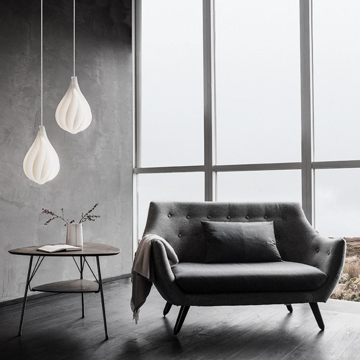 The Alva ceiling lamp by the Danish brand Umage / Vita was designed by Lorenzo Radaelli. The lampshade was inspired by the shape of a classic light bulb, merged into a twisted spiral shape. An eye-catching design that works well in close to any room of the house. Available in different colors.