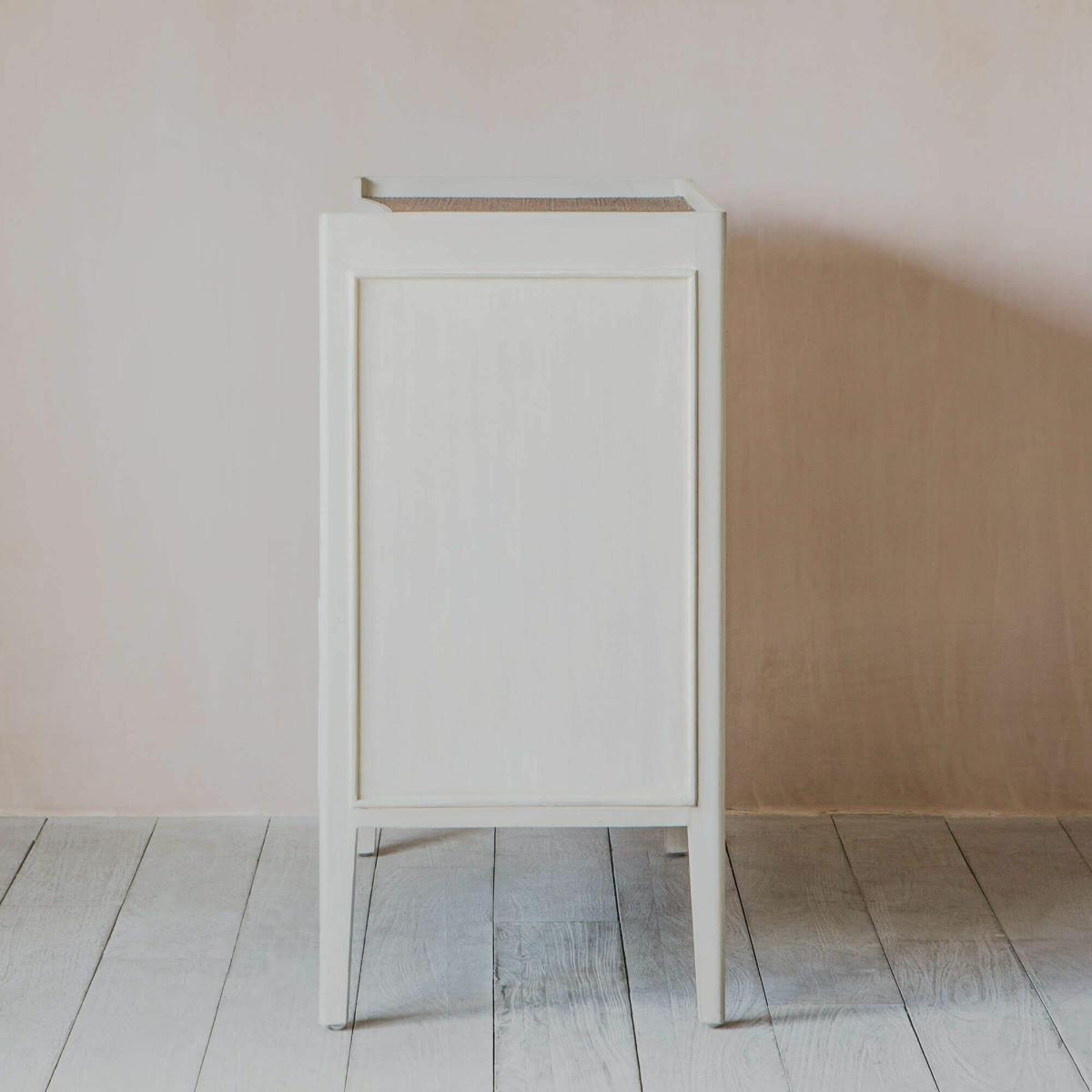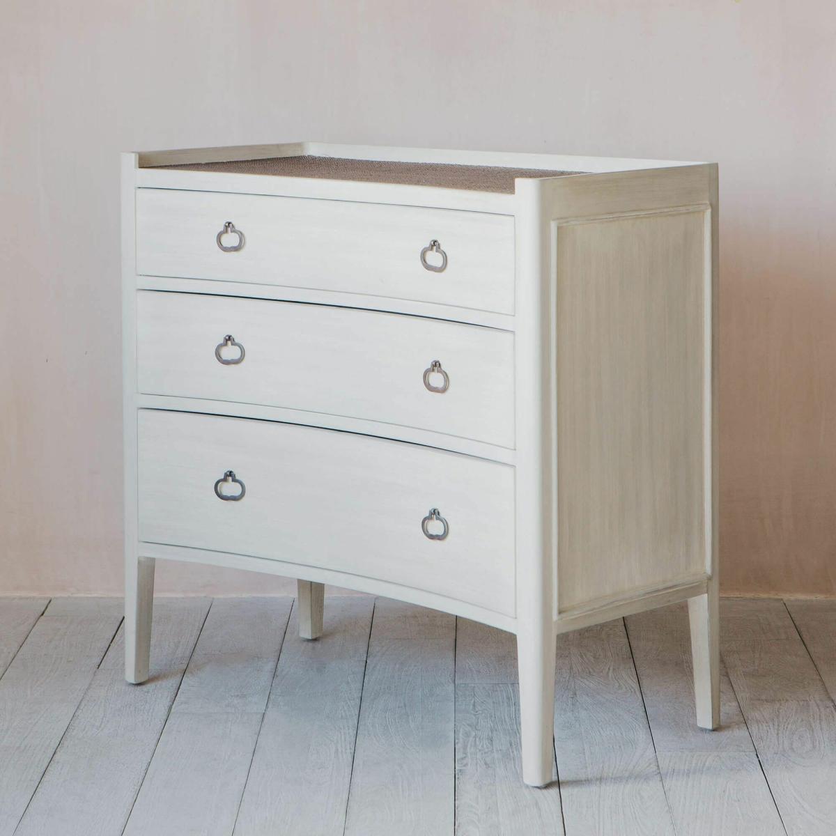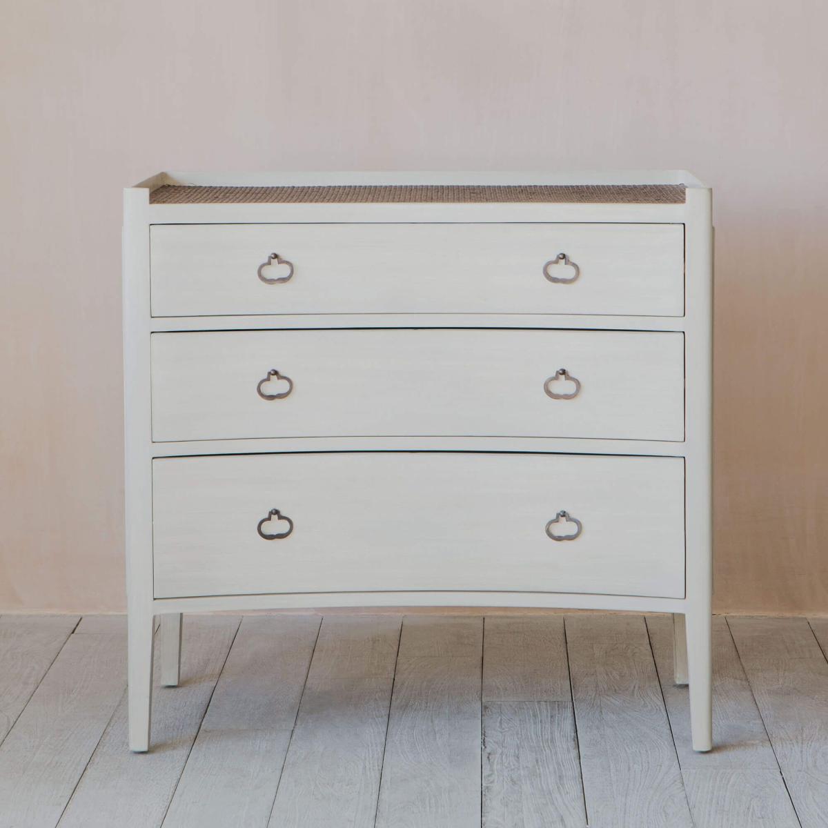 A classic design with finely tapered legs crafted from Durian wood, three generously sized drawers finished with circle handles and a wicker rattan top. With its white-washed finish, this chest of drawers will suit a stylish coastal home.