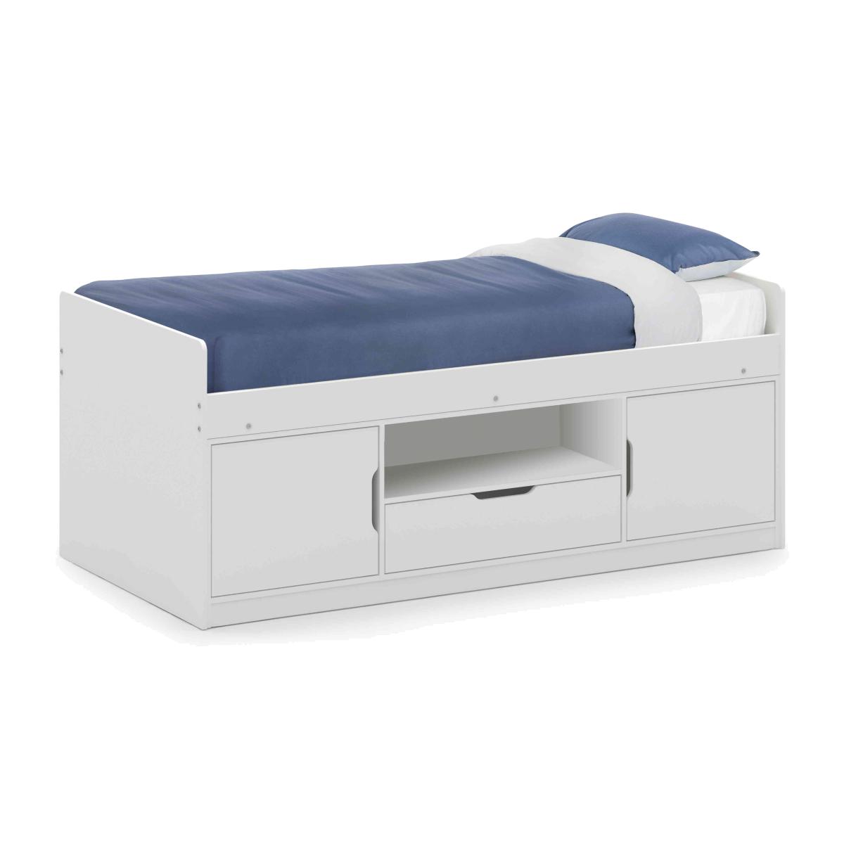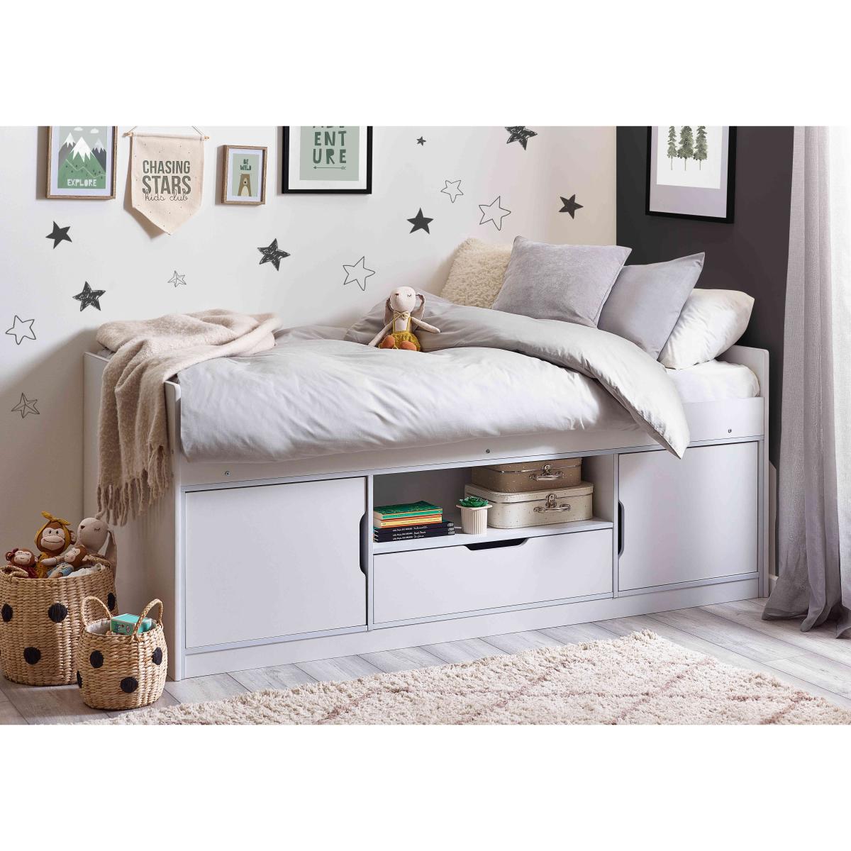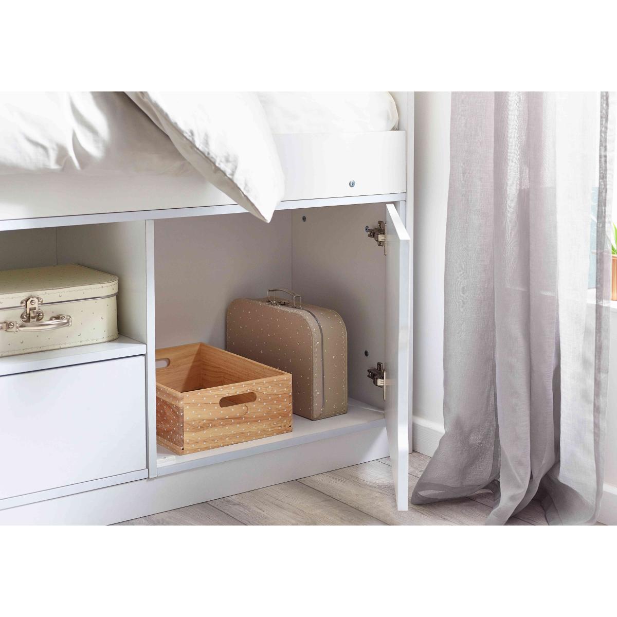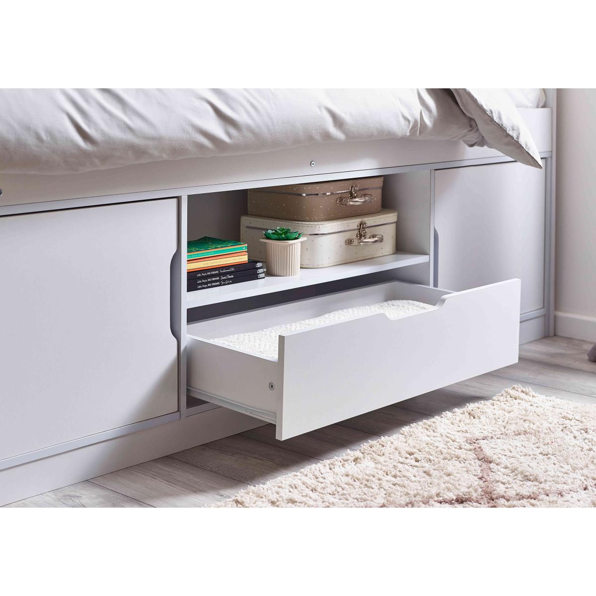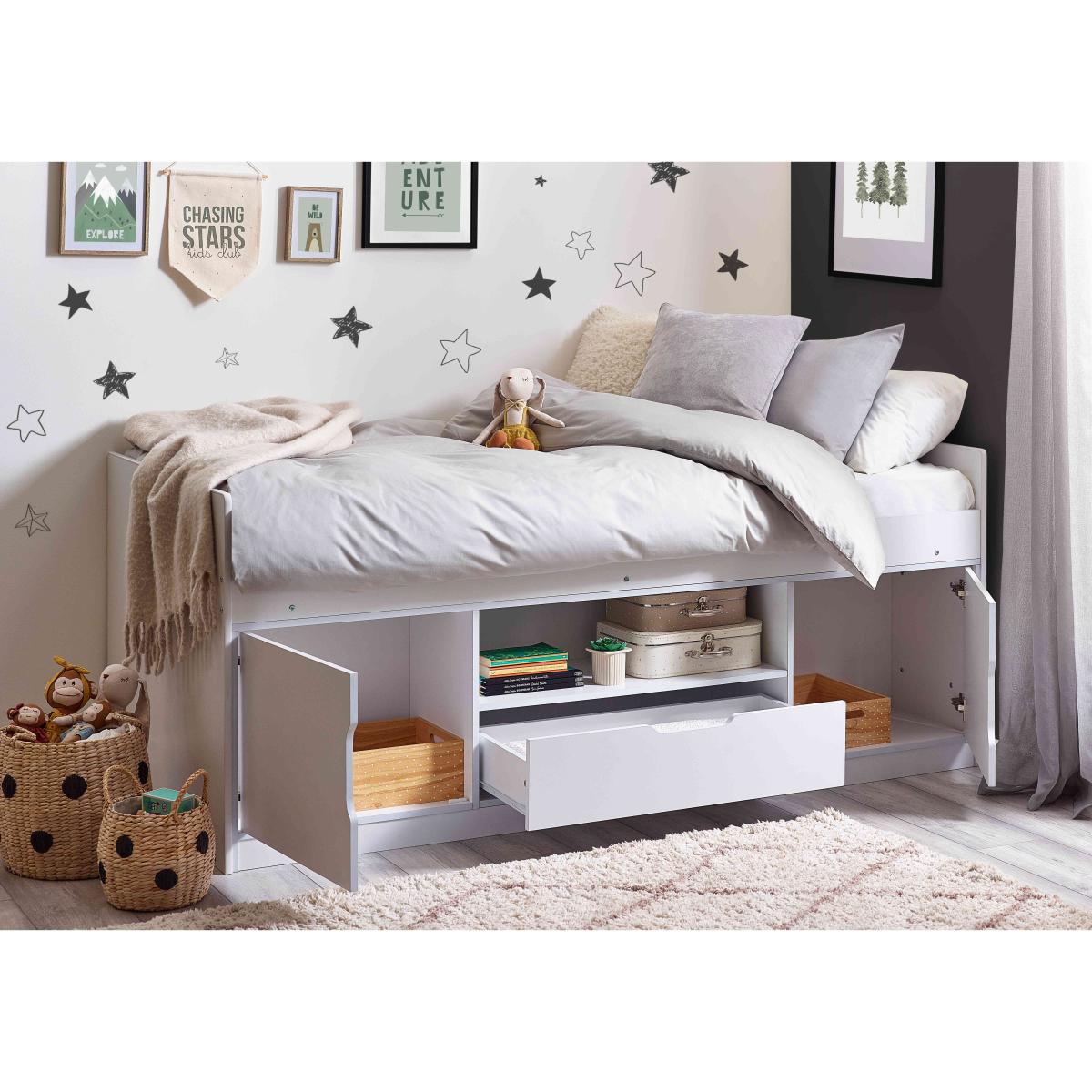 With plenty of storage for books, games, and clothes, the Alva Low Sleeper kids bed is the perfect setup for kids and teenagers looking to maximise their space. Why you'll love it Features cupboards, a drawer, and a shelf for versatile storage. Super easy to assemble with a no-hassle design. Neutral white finish fits in with any bedroom. We also offer a range of kids mattresses that’ll fit perfectly. This kids bed is part of our kids bedroom range from Julian Bowen. What you need to know This bed is not supplied with a mattress included. This product is suitable for children aged 6 and over. Please note this item is self-assembly and will take approximately 120 minutes to assemble. Maximum safe mattress depth is 23 cm. Clearance of 10 cm is required either end for assembly.