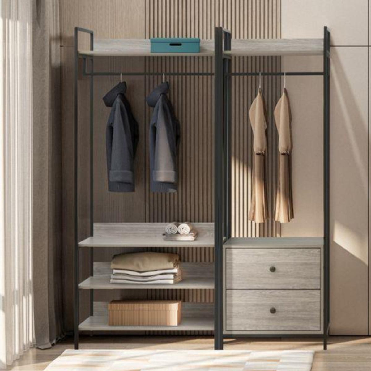 The Alva Pair of Double Open Wardrobes with 2 Drawers and 4 Shelves combines industrial style with modern functionality, offering a cohesive storage solution for your bedroom. Featuring two hanging rails, two spacious drawers, and four lower shelves, these wardrobes provide ample storage while keeping your space feeling open and uncluttered. The oak panels contrast beautifully with the black metal framework, making this set a striking feature in any room. Perfectly designed to work together, this pair offers a seamless blend of style and practicality for all your storage needs!