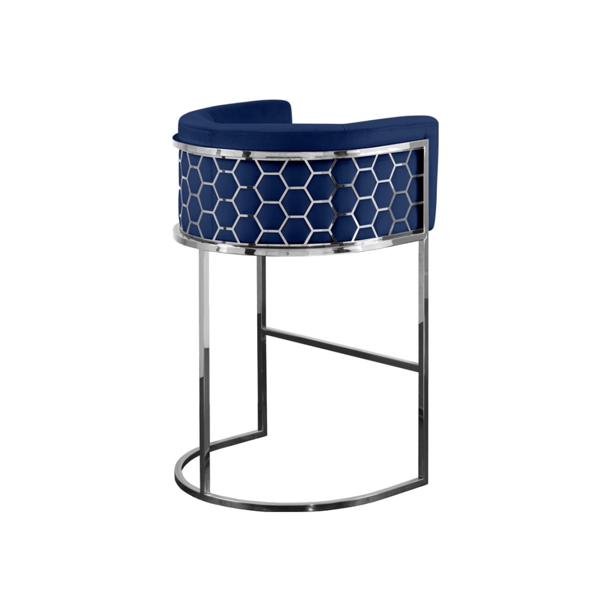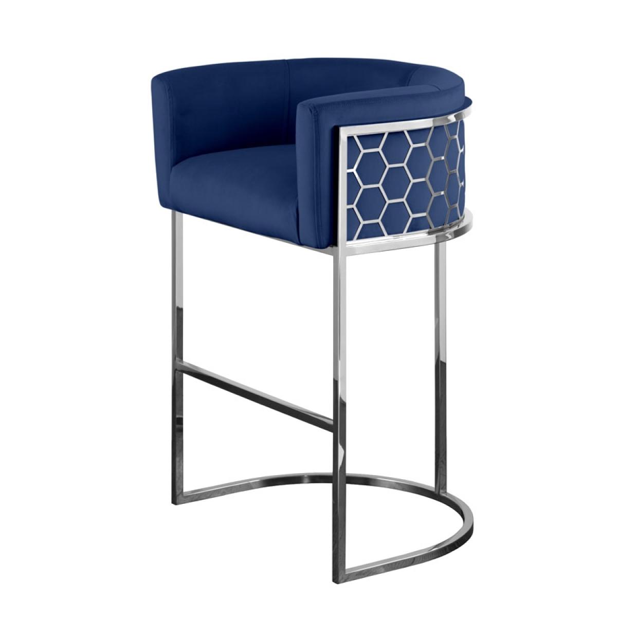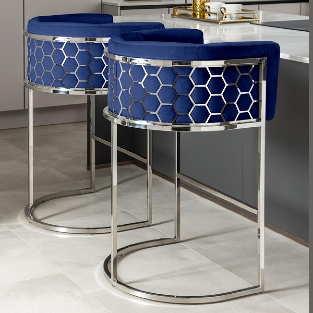 A unique and distinctive bar stool with laser cut hexagonal detailing. Inspired by highly collectable American mid-century furnishings. Steel frame with electroplated chrome finish. Upholstered to order in the UK. ITEM WITH ISSUES. Please Note: Items with issues can be returned as normal. However, they cannot be replaced with new for any reason. Please check photos for any issue(s). This barstool is 10cm taller than ones current sold on our main site. Packaging not new.