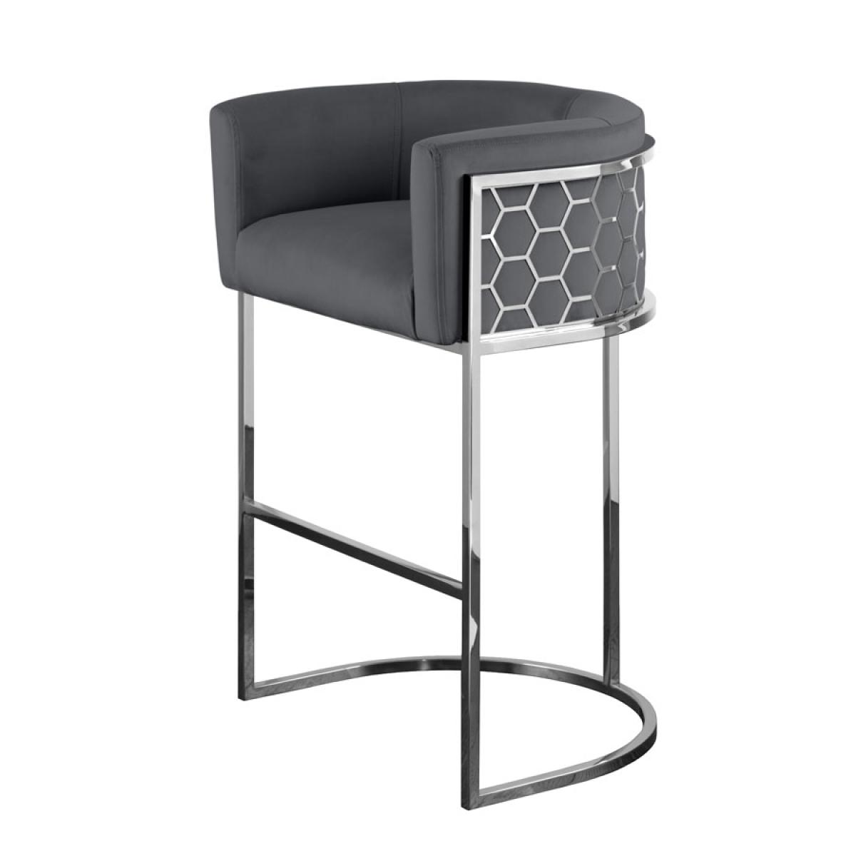 A unique and distinctive bar stool with laser cut hexagonal detailing. Inspired by highly collectable American mid-century furnishings. Steel frame with electroplated chrome finish. Upholstered to order in the UK. ITEM WITH ISSUES. Please Note: Items with issues can be returned as normal. However, they cannot be replaced with new for any reason. Please check photos for any issue(s). This barstool is 10cm taller than ones currently sold on our main site. Packaging not new.