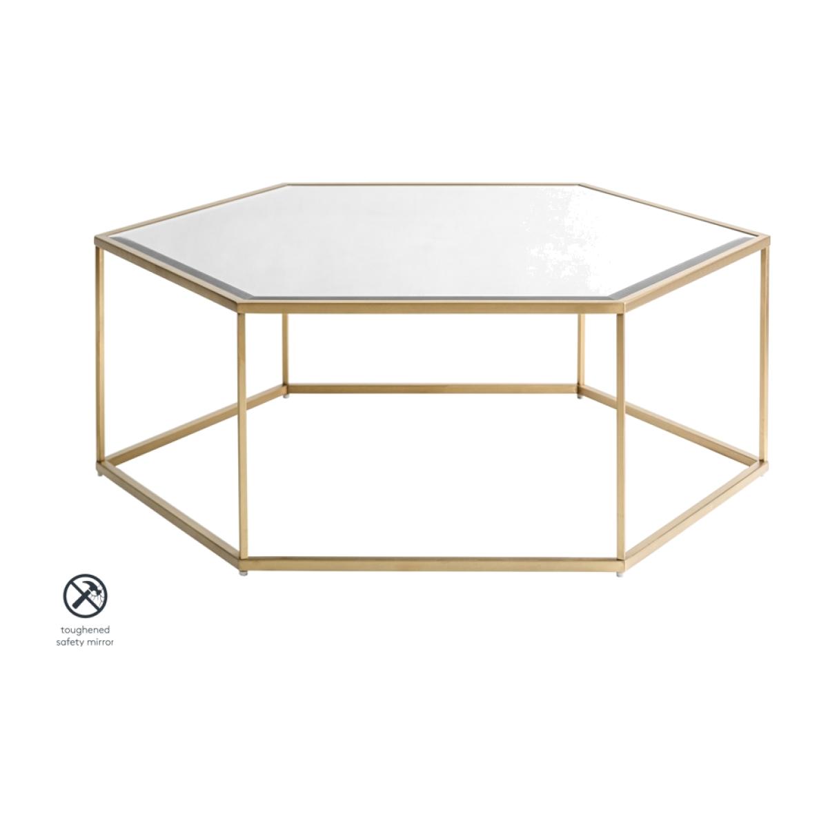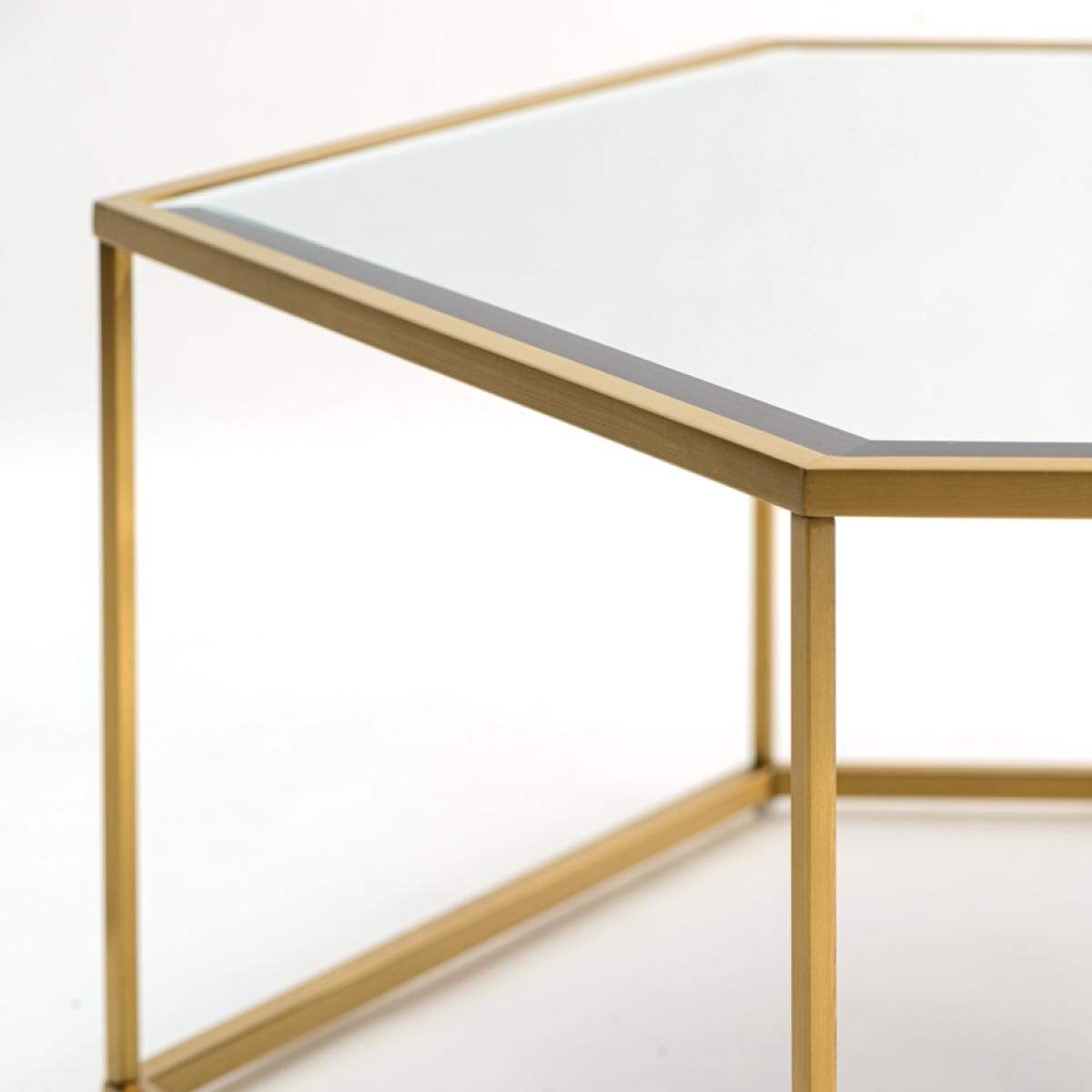 A timeless, elegant hexagonal coffee table. Brushed stainless steel frame with brass finish. Extremely strong toughened mirror with deep bevelled edge. Can be used in multiples to create a large honeycomb effect centrepiece.