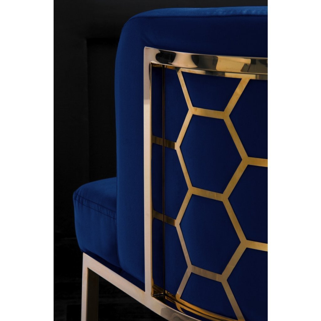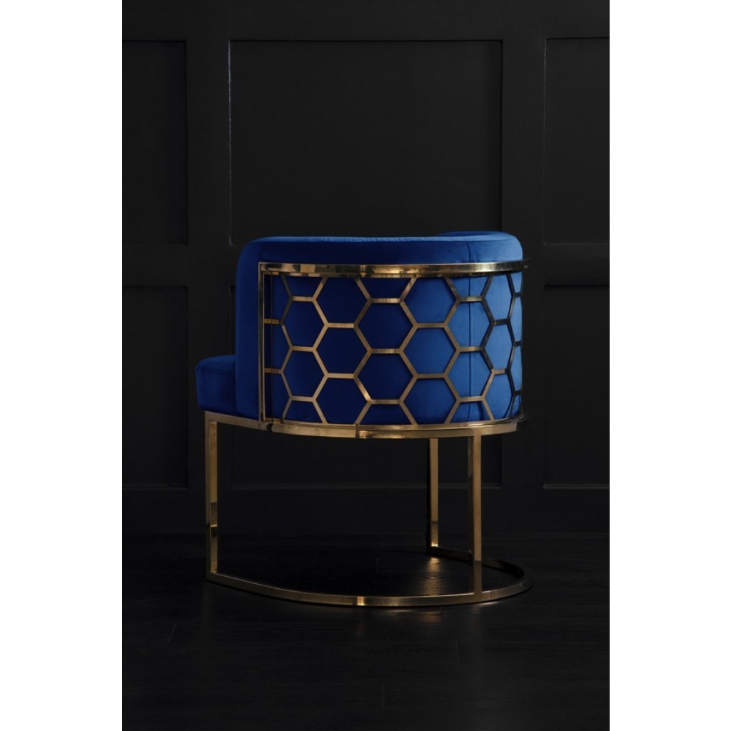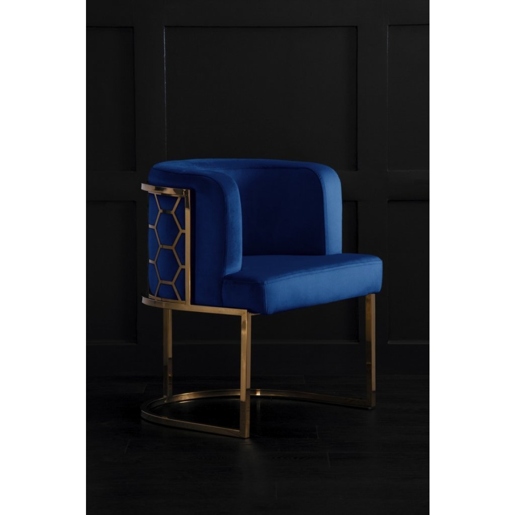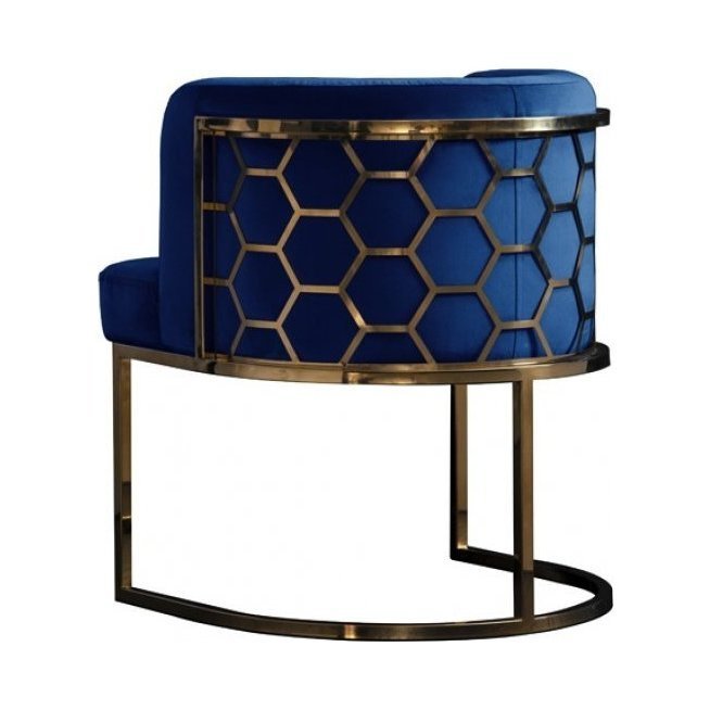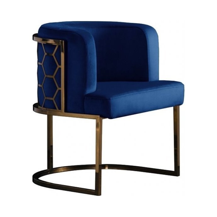 A unique and distinctive dining chair with laser cut hexagonal detailing Inspired by highly collectable American mid-century furnishings Steel frame with electroplated brass finish Upholstered to order in the UK Velvet fabric, available in a selection of colours Can be upholstered in customers own fabric, subject to suitability