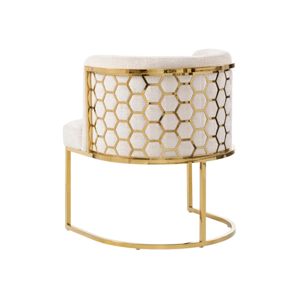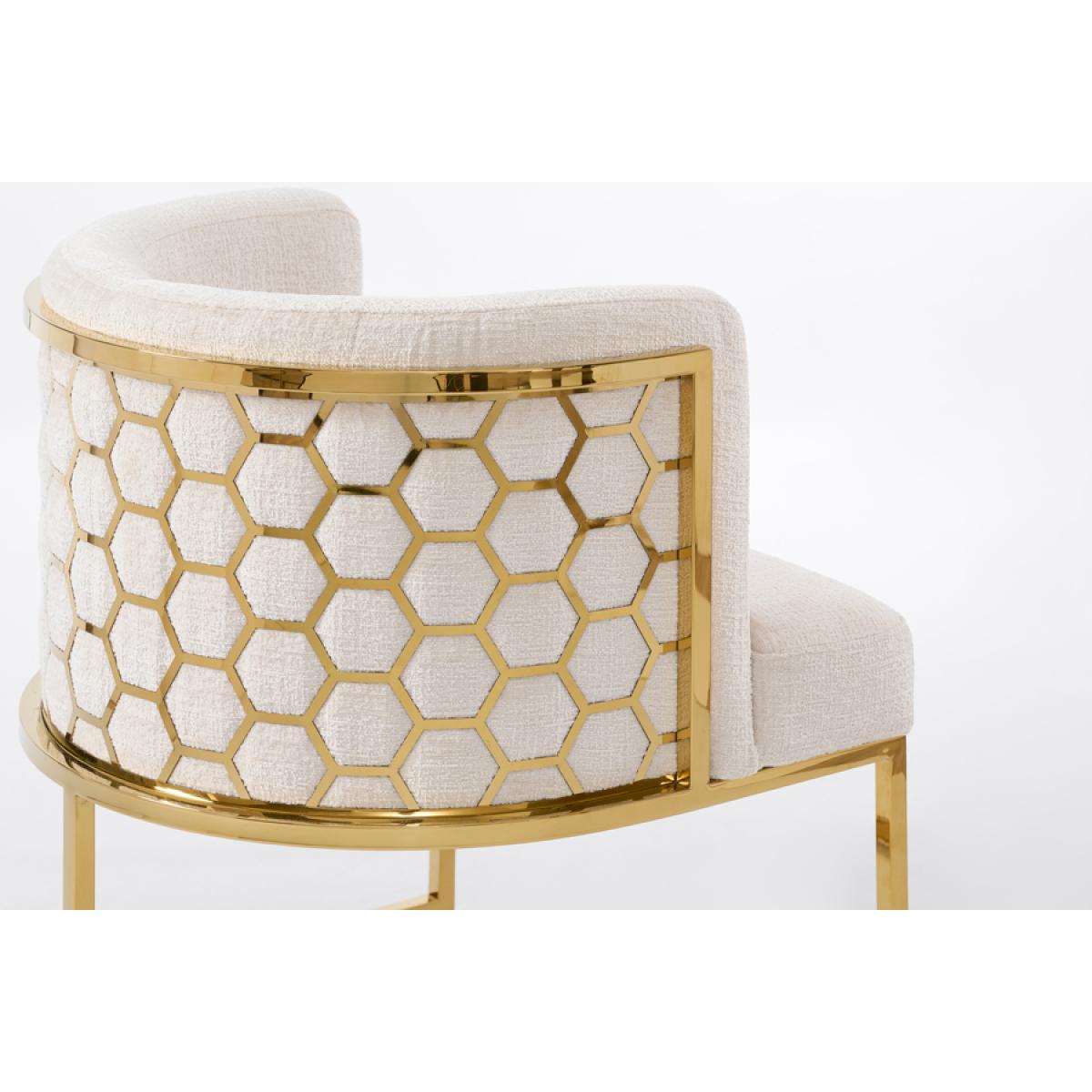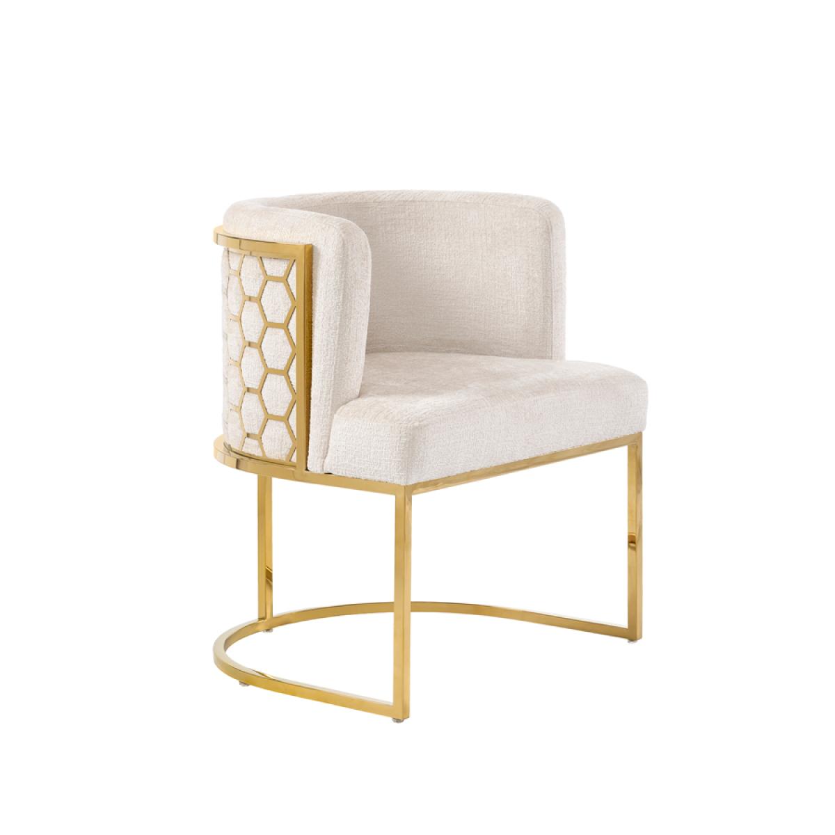 A unique and distinctive dining chair with laser-cut hexagonal detailing. Inspired by highly collectable American mid-century furnishings. Steel frame with electroplated brass finish. Upholstered in a soft, tactile, chenille fabric. Can be upholstered in customers' own fabric, subject to suitability.