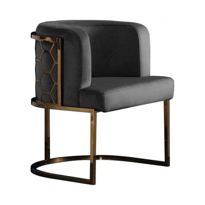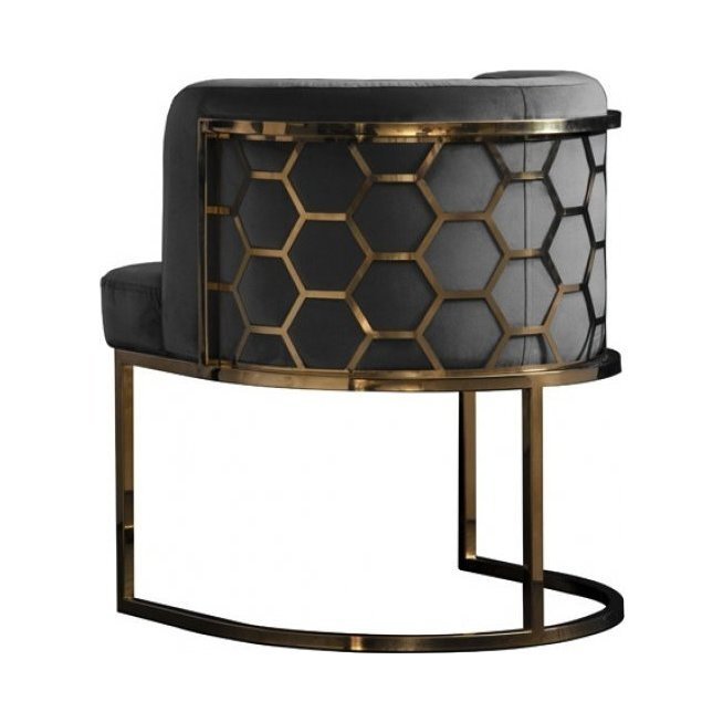 A unique and distinctive dining chair with laser cut hexagonal detailing Inspired by highly collectable American mid-century furnishings Steel frame with electroplated brass finish Upholstered to order in the UK Velvet fabric, available in a selection of colours Can be upholstered in customers own fabric, subject to suitability