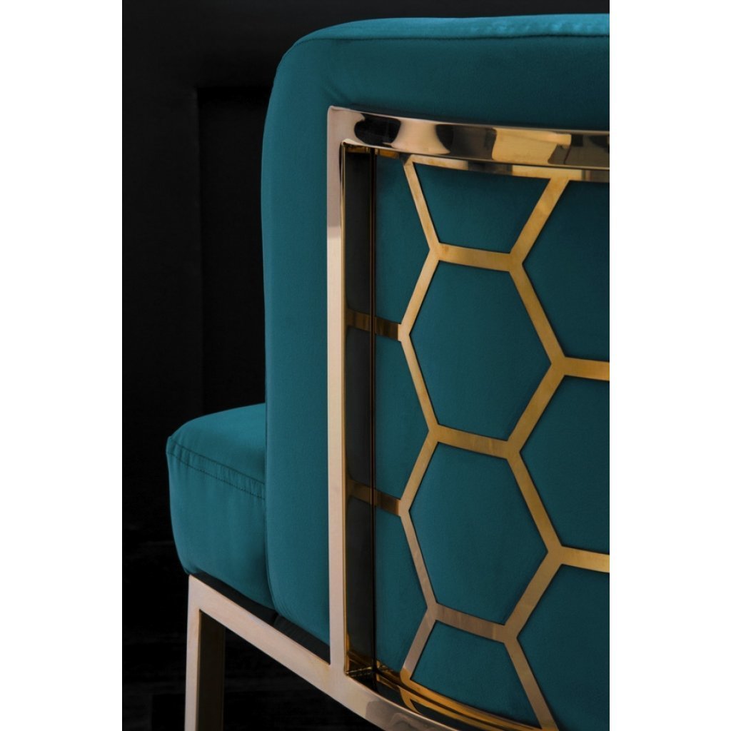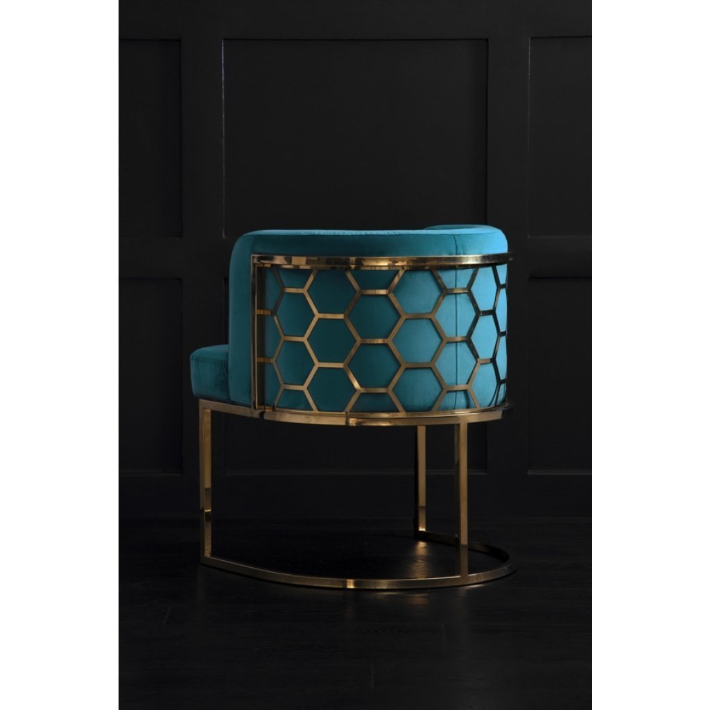 A unique and distinctive dining chair with laser cut hexagonal detailing Inspired by highly collectable American mid-century furnishings Steel frame with electroplated brass finish Upholstered to order in the UK Velvet fabric, available in a selection of colours Can be upholstered in customers own fabric, subject to suitability