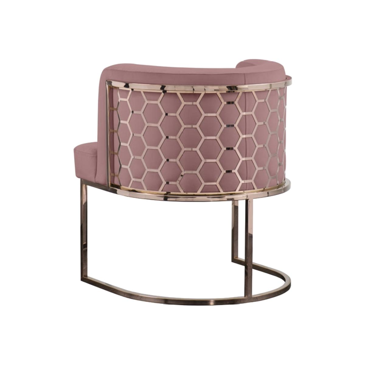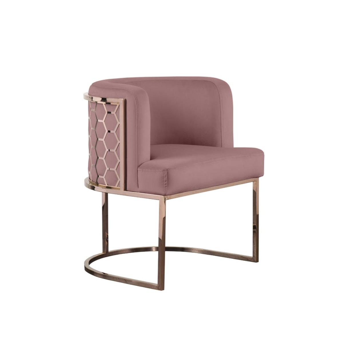 A unique and distinctive dining chair with laser cut hexagonal detailing. Inspired by highly collectable American mid-century furnishings. Steel frame with electroplated Rose gold finish. Upholstered to order in the UK. Velvet fabric, available in a selection of colours. Can be upholstered in customers own fabric, subject to suitability.