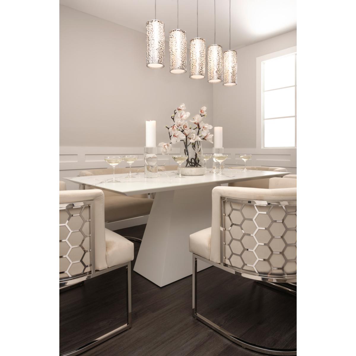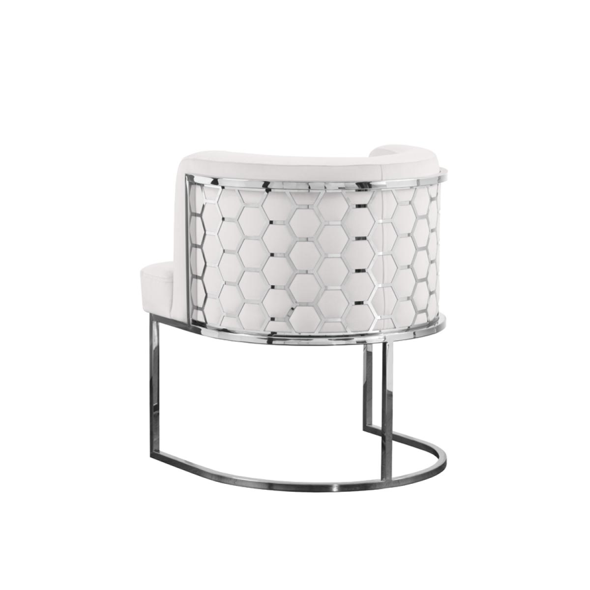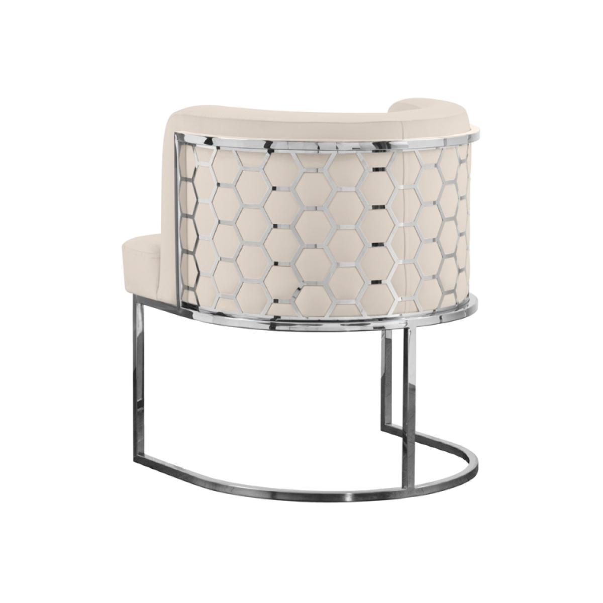 A unique and distinctive dining chair with laser-cut hexagonal detailing. Inspired by highly collectable American mid-century furnishings. Steel frame with electroplated chrome finish. Velvet fabric, available in a selection of colours, upholstered to order in the UK. We recommend that customers email or call to request a free fabric swatch to check the colour as on-screen representations can vary. Can be upholstered in customers' own fabric, subject to suitability.