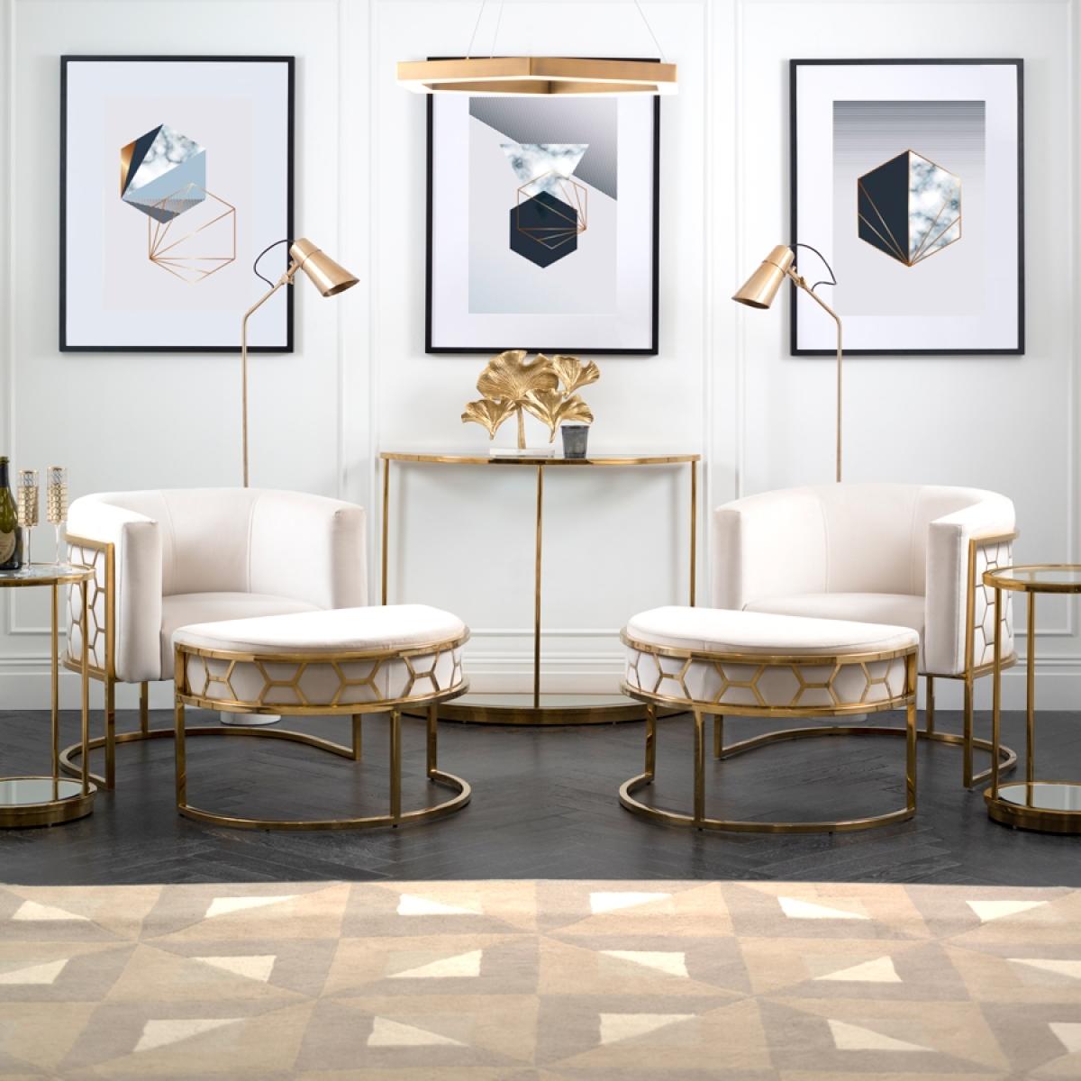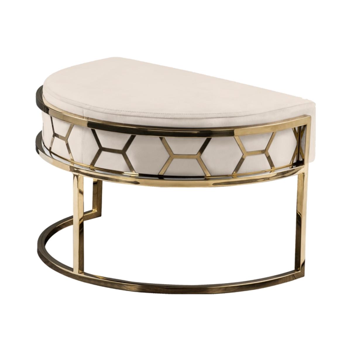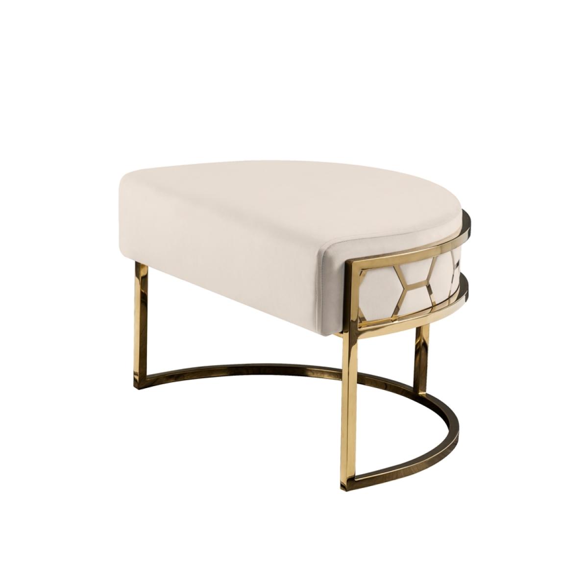 A unique and distinctive footstool with laser cut hexagonal detailing. Designed to be used alone or as an extension to the Alveare Tub Chair. Inspired by highly collectable Mid-Century American furnishings. Steel frame with electroplated brass finish. Upholstered to order in the UK. Velvet upholstery fabric, available in a selection of colours. Can be upholstered in customers own fabric subject to suitability. We recommend that customers request a free swatch of Fabric, to check the colour as on screen colour can vary. As this item is bespoke made, returns cannot be accepted due to the colour. Please E-mail or call for a swatch.