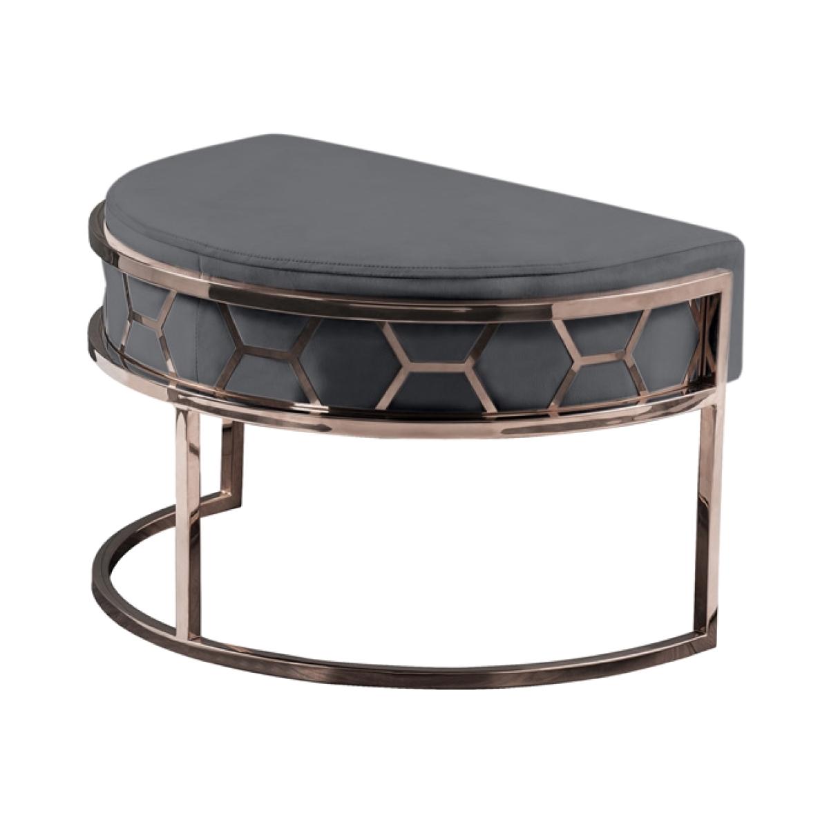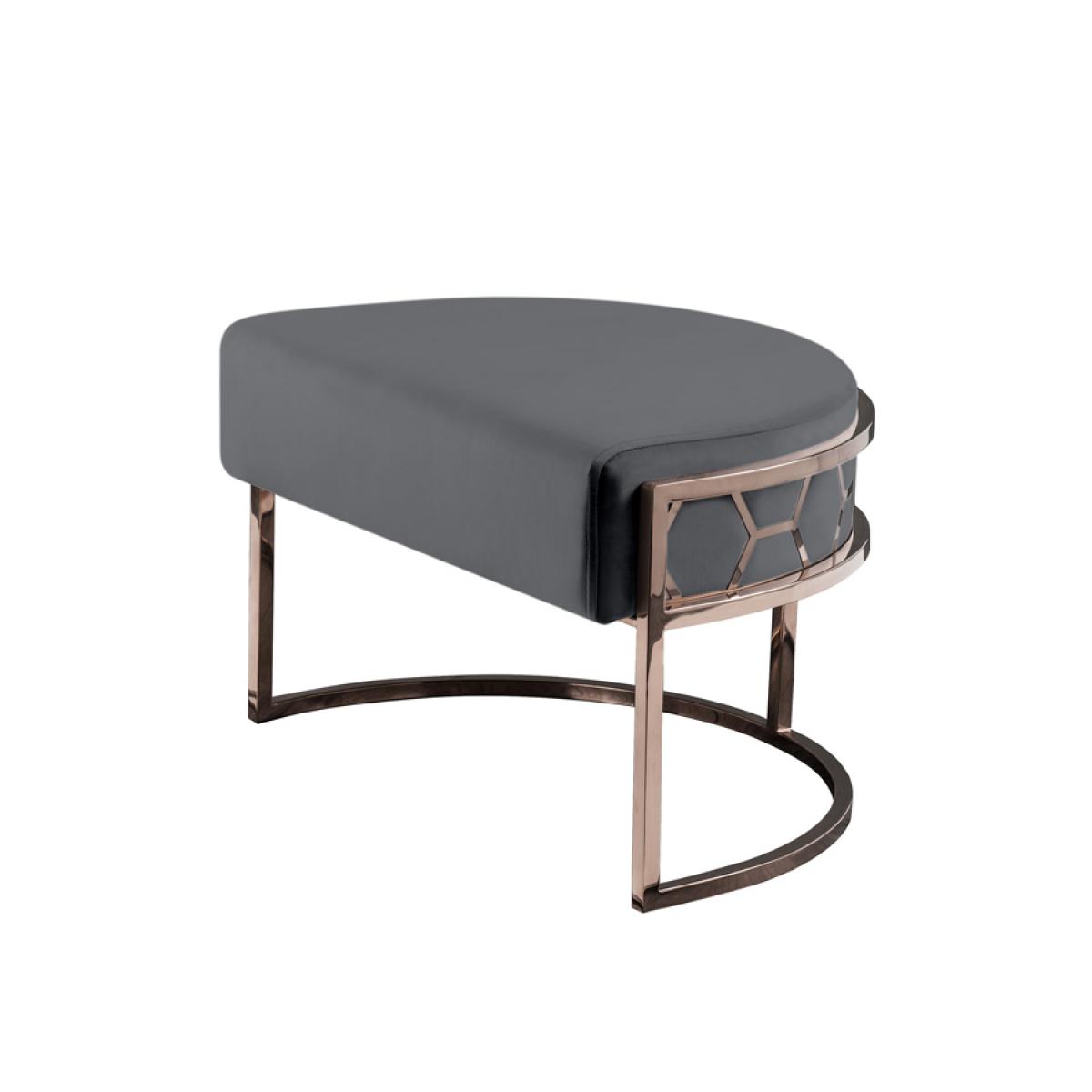 A unique and distinctive footstool with laser-cut hexagonal detailing. Inspired by highly collectable American mid-century furnishings. Steel frame with electroplated copper finish. Velvet fabric, available in a selection of colours, upholstered to order in the UK. We recommend that customers email or call to request a free fabric swatch to check the colour as on-screen representations can vary. Can be upholstered in customers' own fabric, subject to suitability.