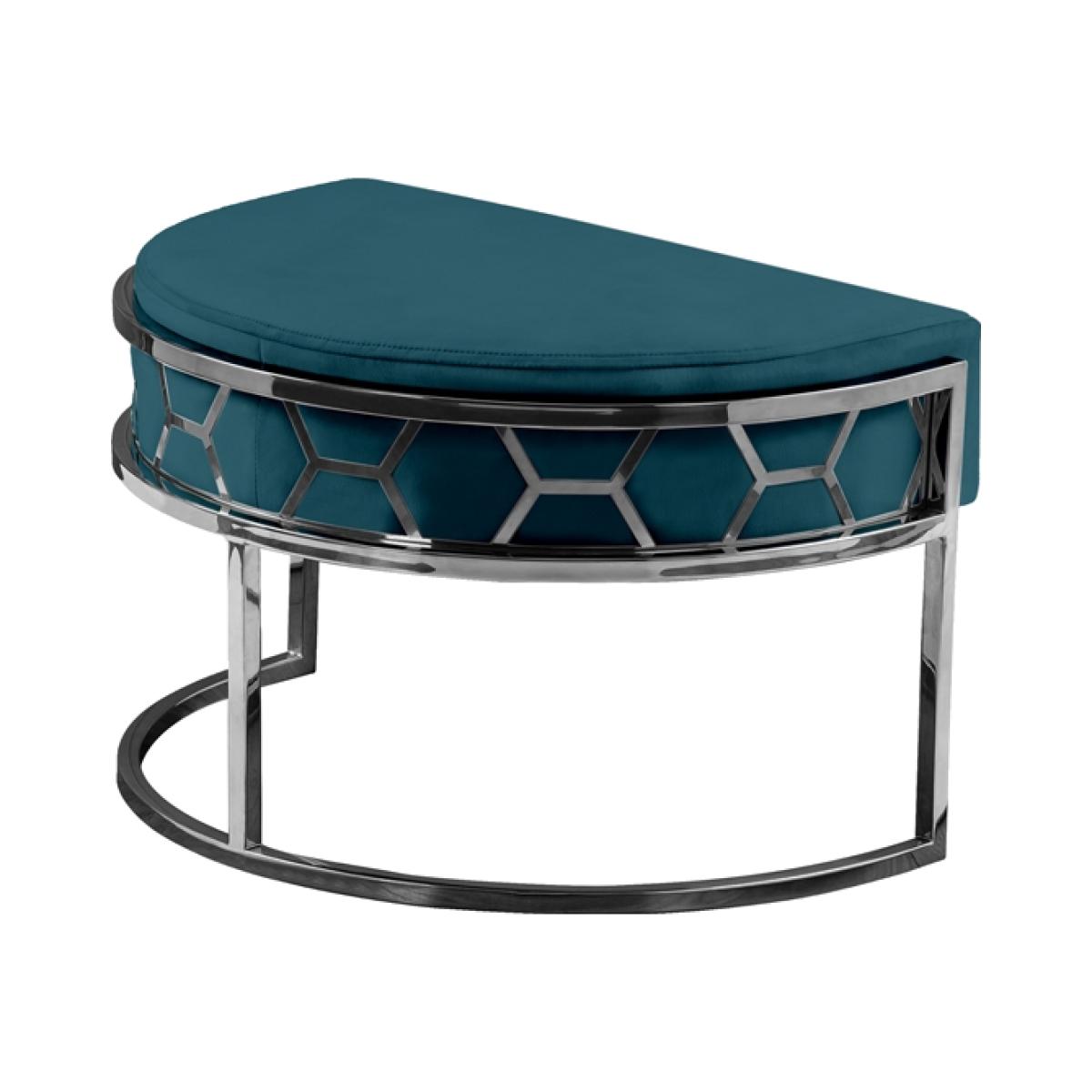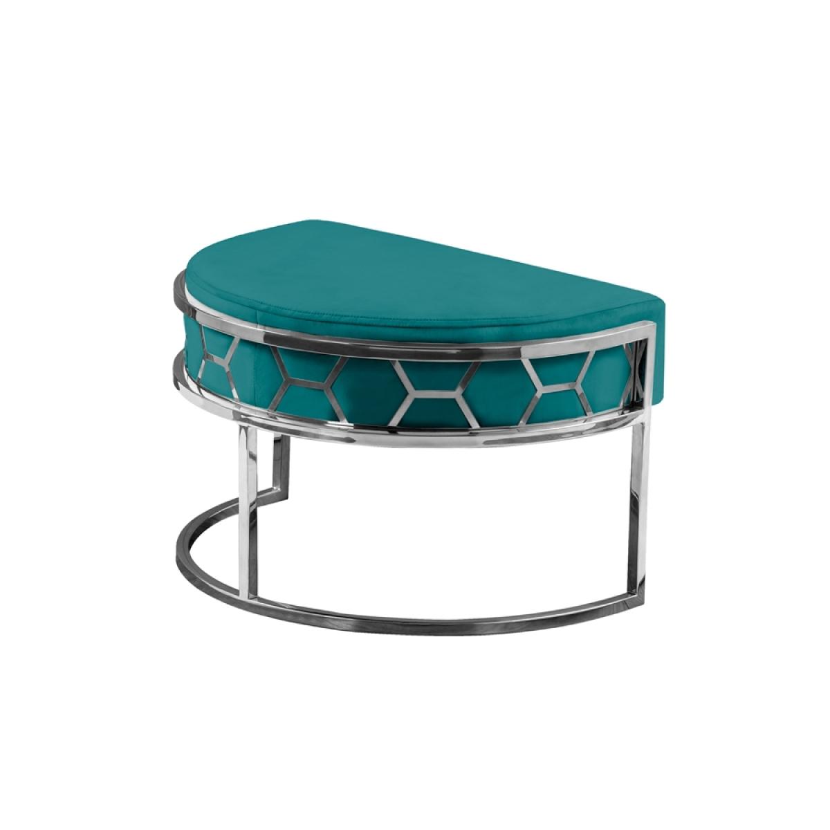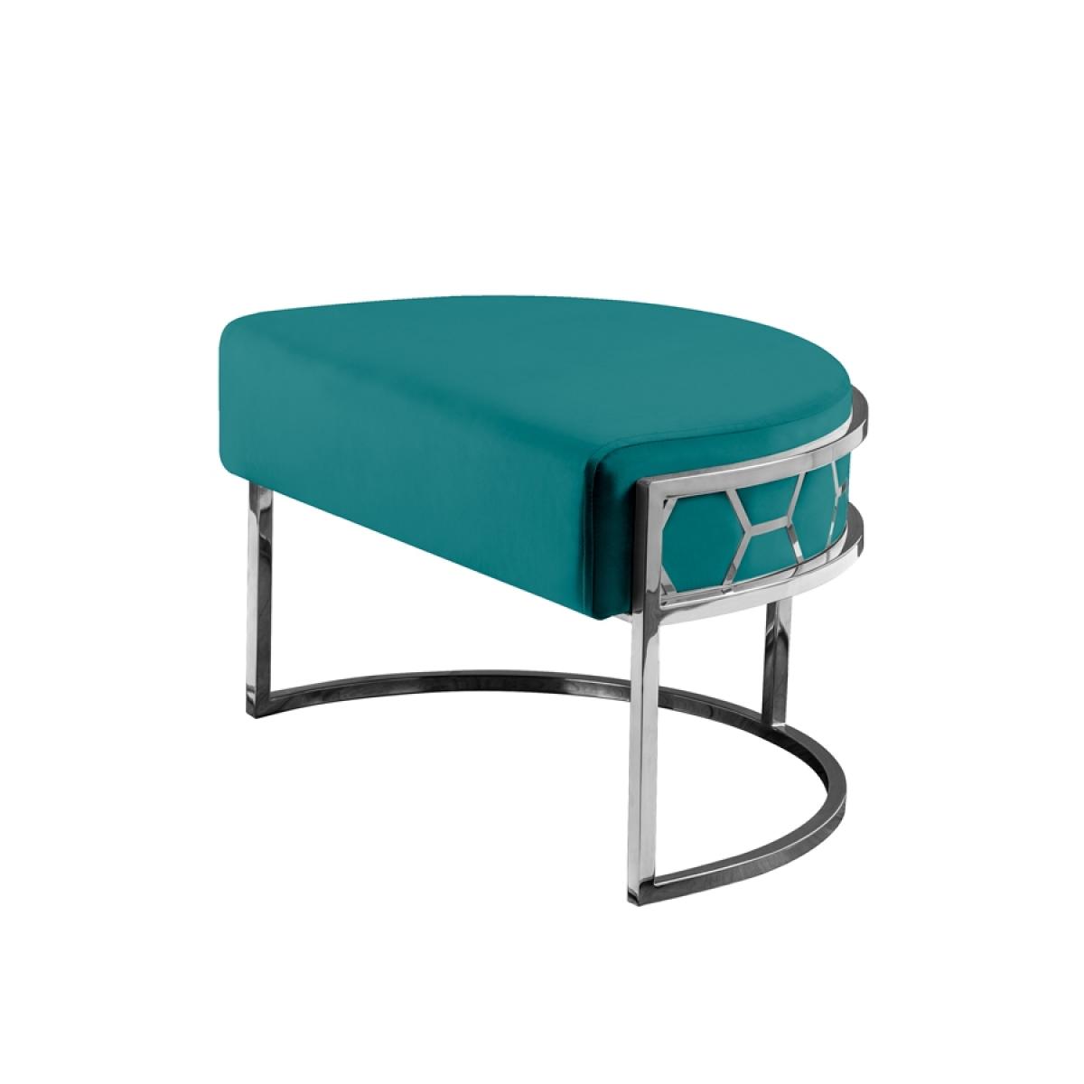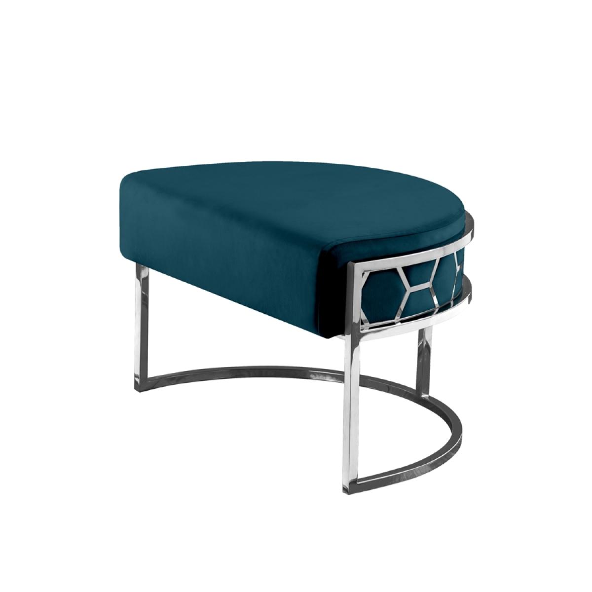 A unique and distinctive footstool with laser cut hexagonal detailing. Designed to be used alone or as an extension to the Alveare Tub Chair. Inspired by highly collectable Mid-Century American furnishings. Steel frame with electroplated chrome finish. Upholstered to order in the UK. Velvet upholstery fabric, available in a selection of colours. Can be upholstered in customers own fabric subject to suitability.