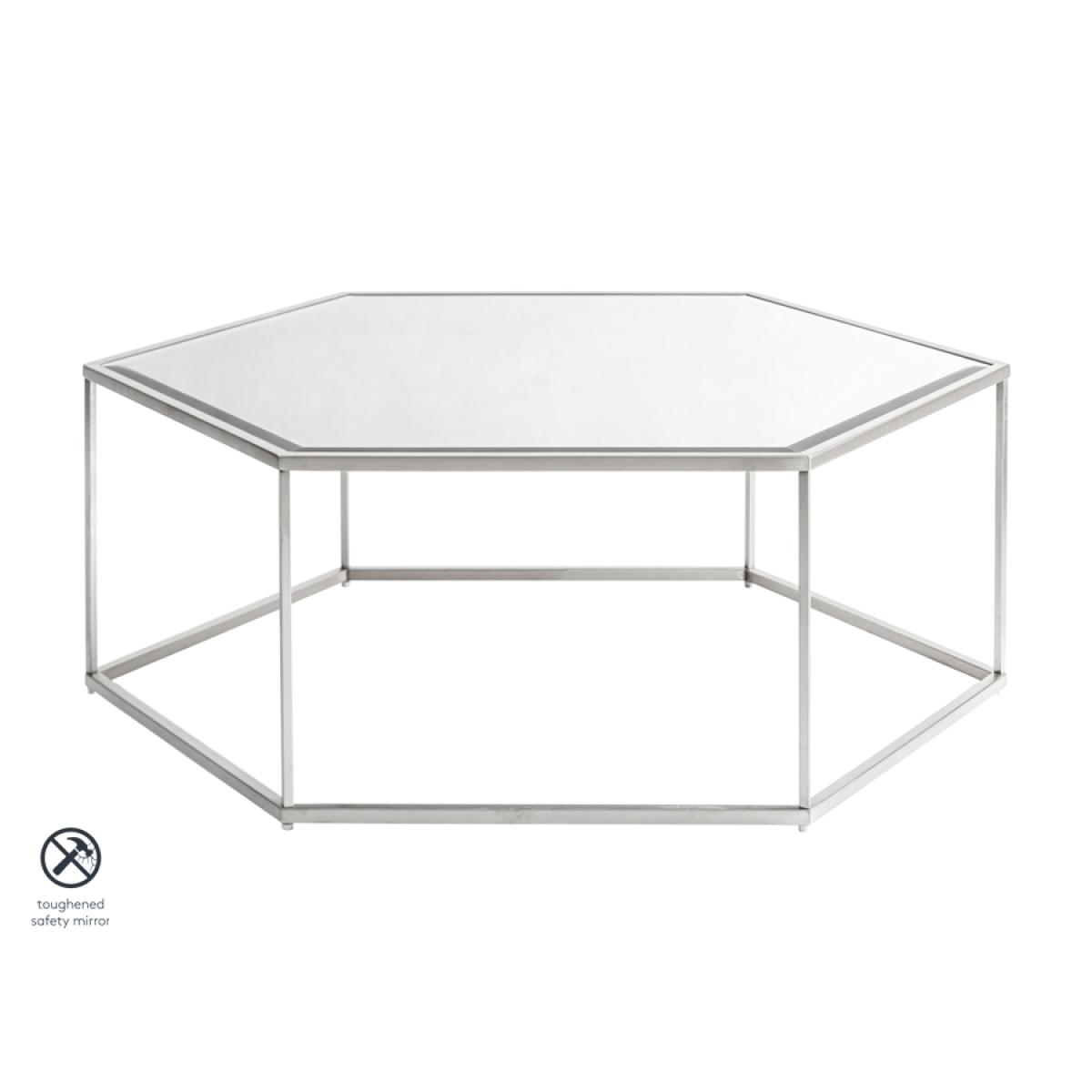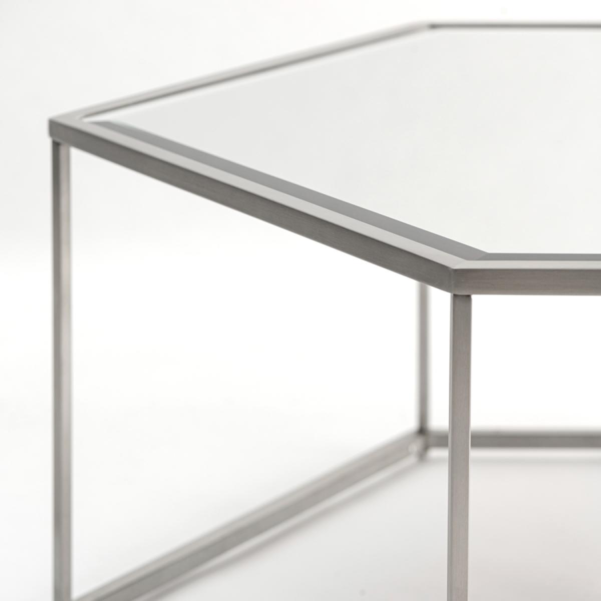 A timeless, elegant hexagonal coffee table. Brushed stainless steel frame. Extremely strong toughened mirror with deep bevelled edge. Can be used in multiples to create a large honeycomb effect centrepiece.