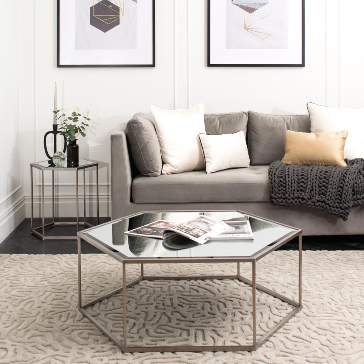 A timeless, elegant hexagonal side table. Brushed stainless steel frame. Extremely strong toughened mirror with deep bevelled edge. Can be used in multiples to create a larger honeycomb effect table.