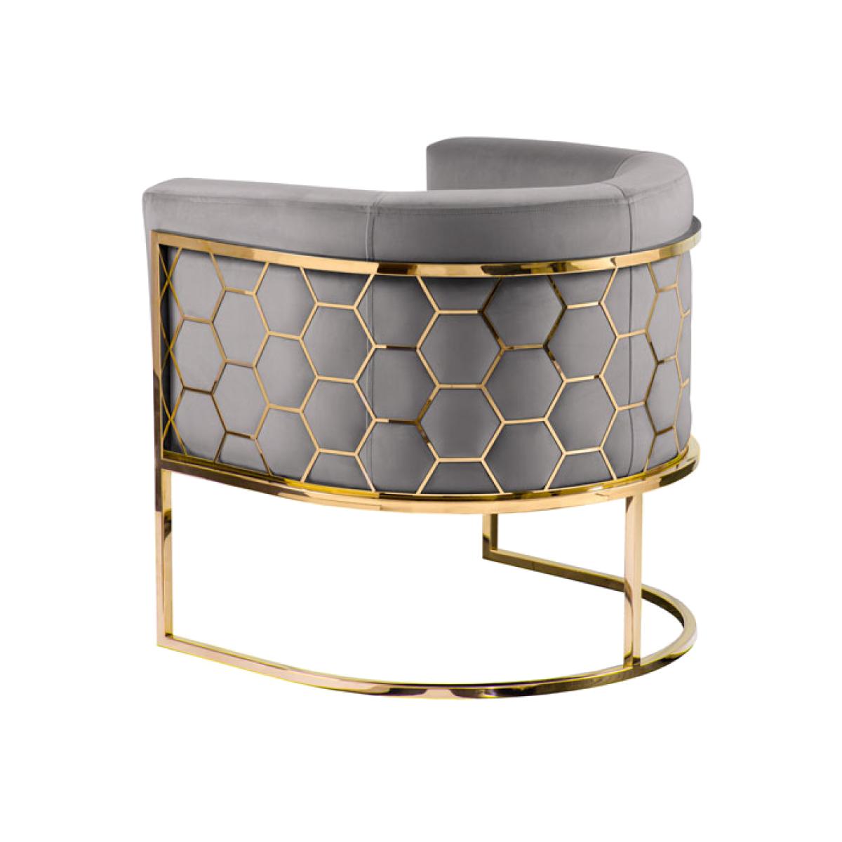 A unique and distinctive tub chair with laser-cut hexagonal detailing. Inspired by highly collectable American mid-century furnishings. Steel frame with electroplated brass finish. Velvet fabric, available in a selection of colours, upholstered to order in the UK. We recommend that customers email or call to request a free fabric swatch to check the colour as on-screen representations can vary. Can be upholstered in customers' own fabric, subject to suitability.