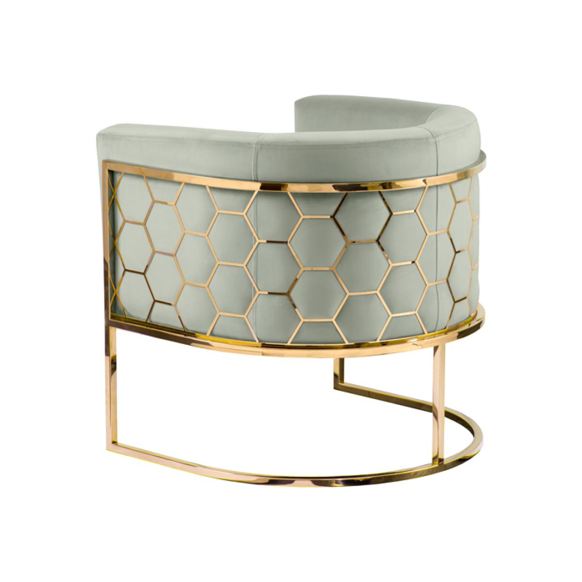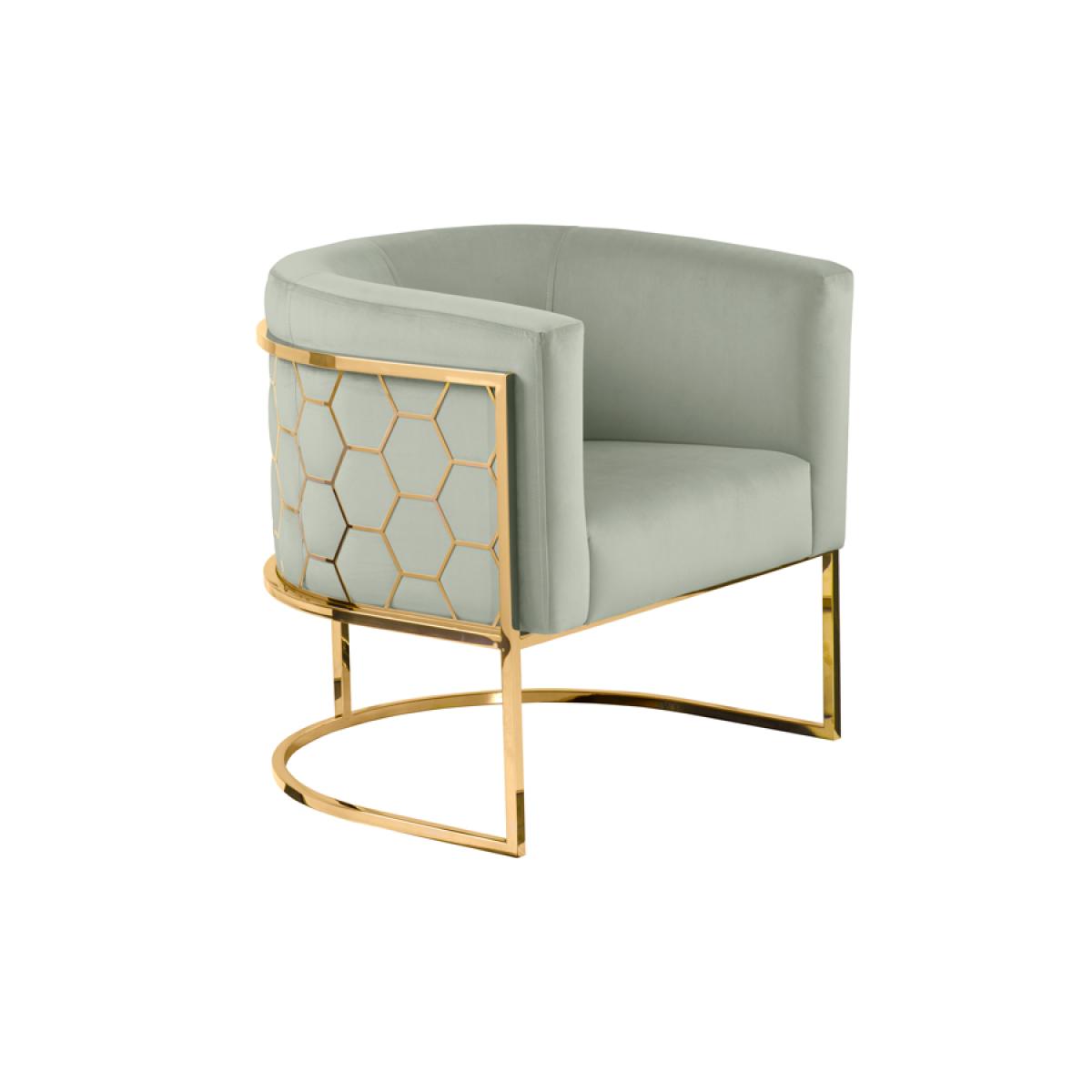 A unique and distinctive tub chair with laser-cut hexagonal detailing. Inspired by highly collectable American mid-century furnishings. Steel frame with electroplated brass finish. Velvet fabric, available in a selection of colours, upholstered to order in the UK. We recommend that customers email or call to request a free fabric swatch to check the colour as on-screen representations can vary. Can be upholstered in customers' own fabric, subject to suitability.