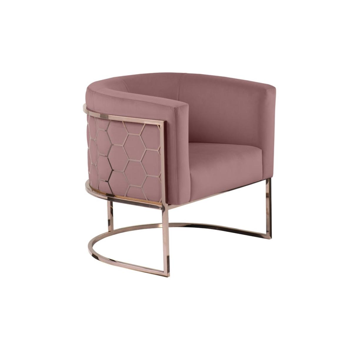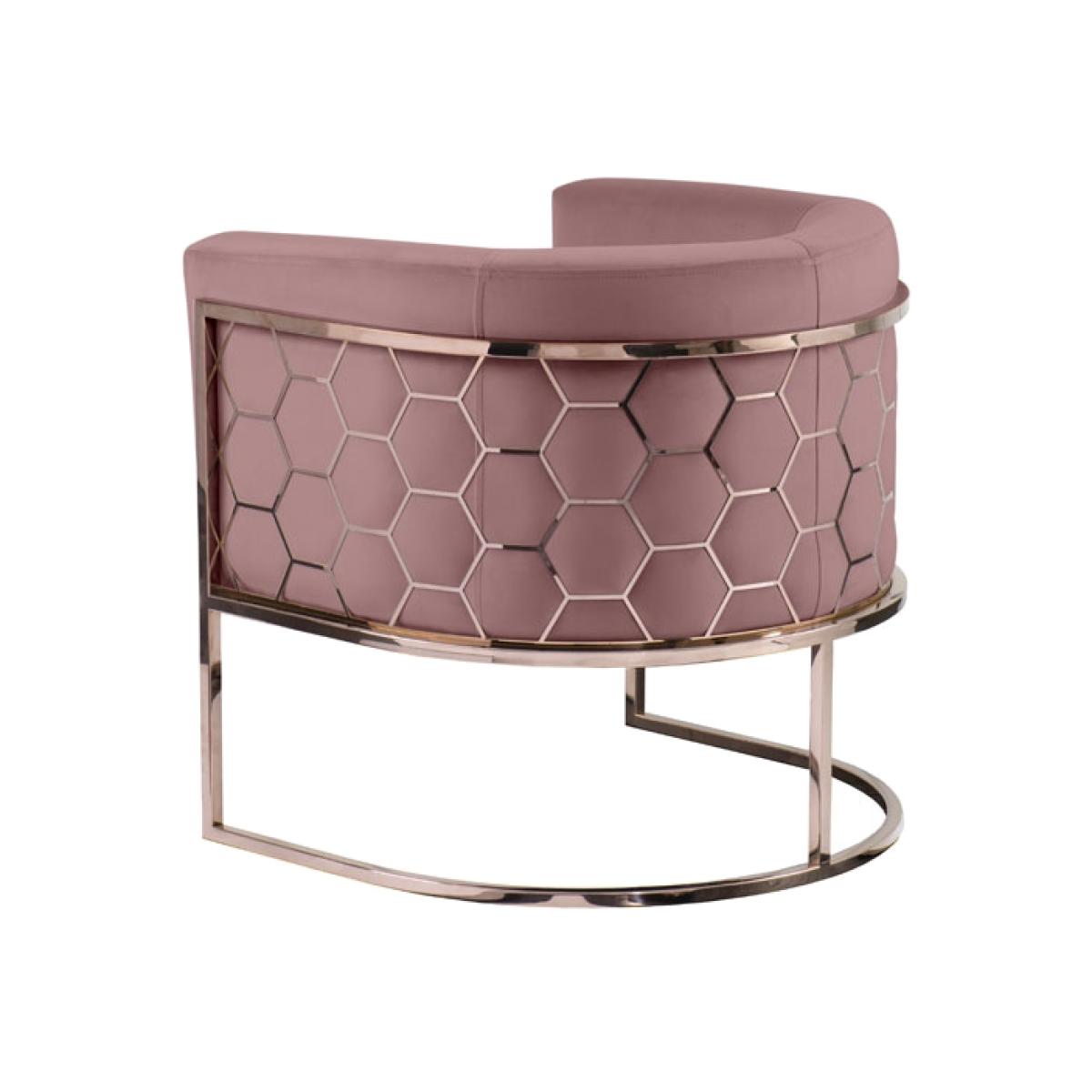 A unique and distinctive tub chair with laser-cut hexagonal detailing. Inspired by highly collectable American mid-century furnishings. Steel frame with electroplated copper finish. Velvet fabric, available in a selection of colours, upholstered to order in the UK. We recommend that customers email or call to request a free fabric swatch to check the colour as on-screen representations can vary. Can be upholstered in customers' own fabric, subject to suitability.