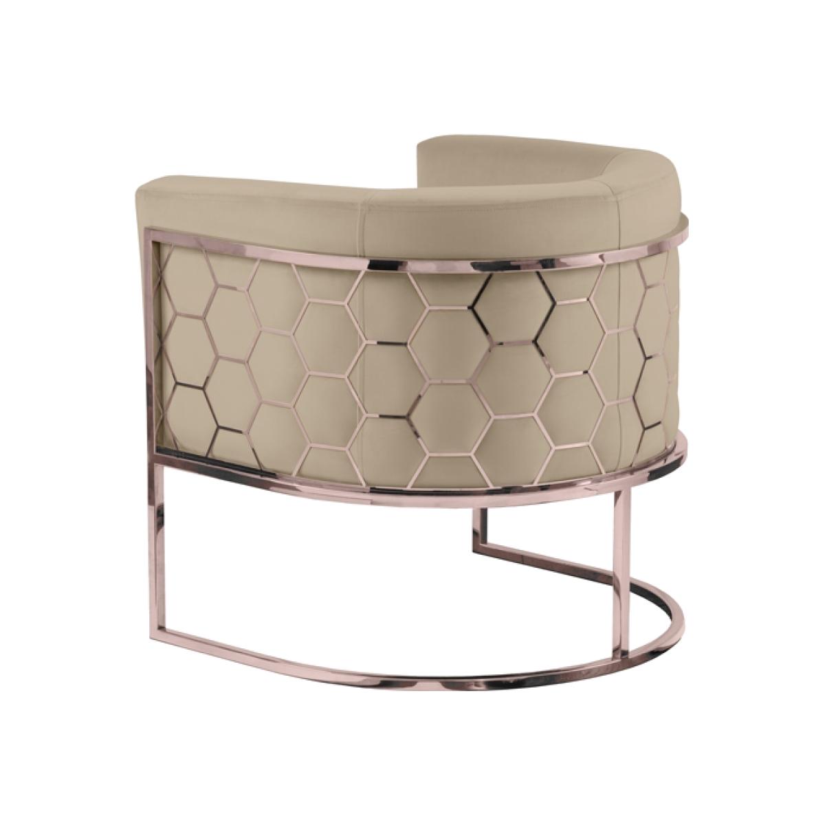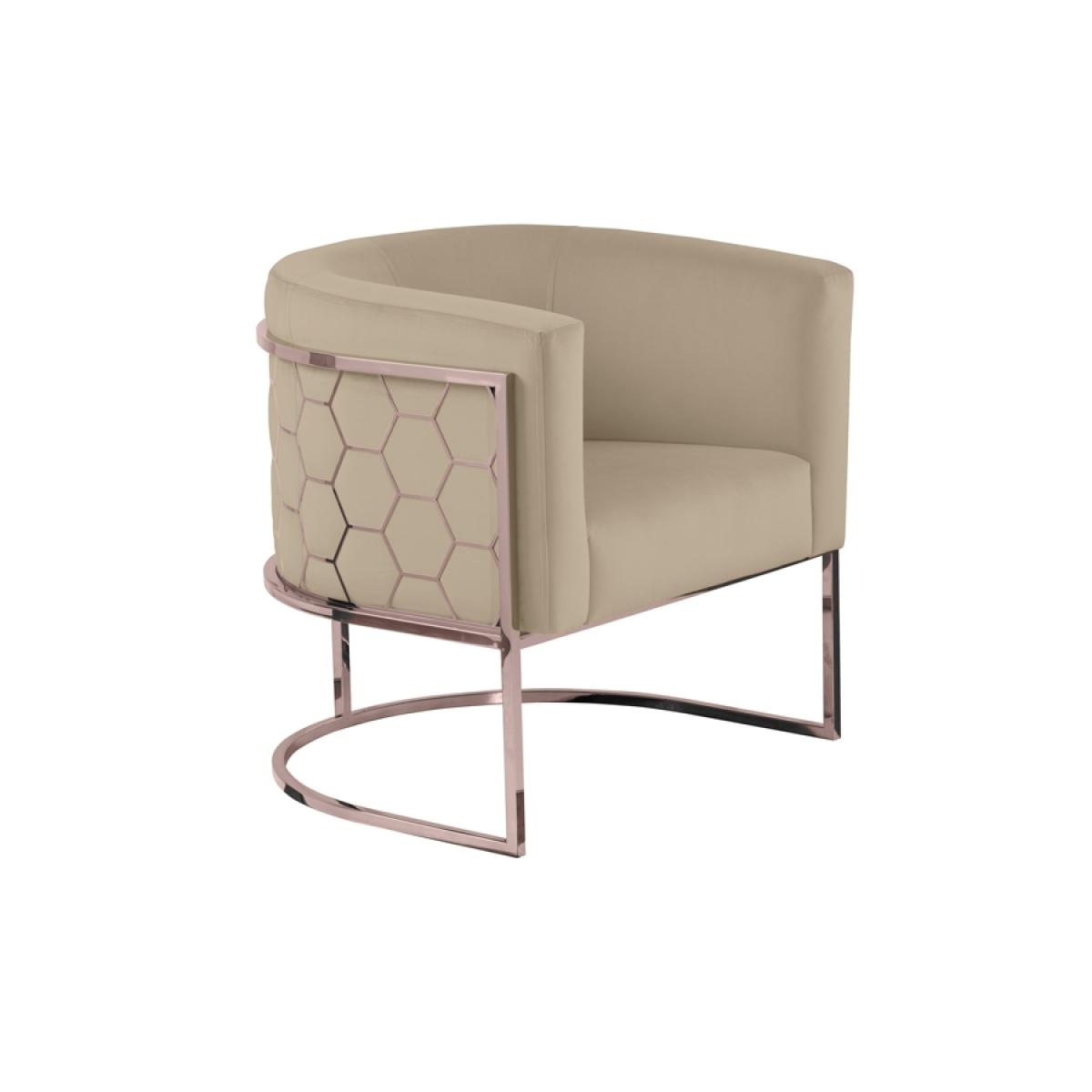 A unique and distinctive tub chair with laser cut hexagonal detailing. Inspired by highly collectable American mid-century furnishings. Steel frame with electroplated rose gold finish. Upholstered to order in the UK. Velvet fabric, available in a selection of colours. Can be upholstered in customers own fabric, subject to suitability. We recommend that customers request a free swatch of Fabric, to check the colour as on screen colour can vary. As this item is bespoke made, returns cannot be accepted due to the colour. Please E-mail or call for a swatch.