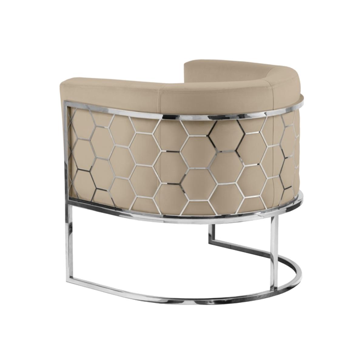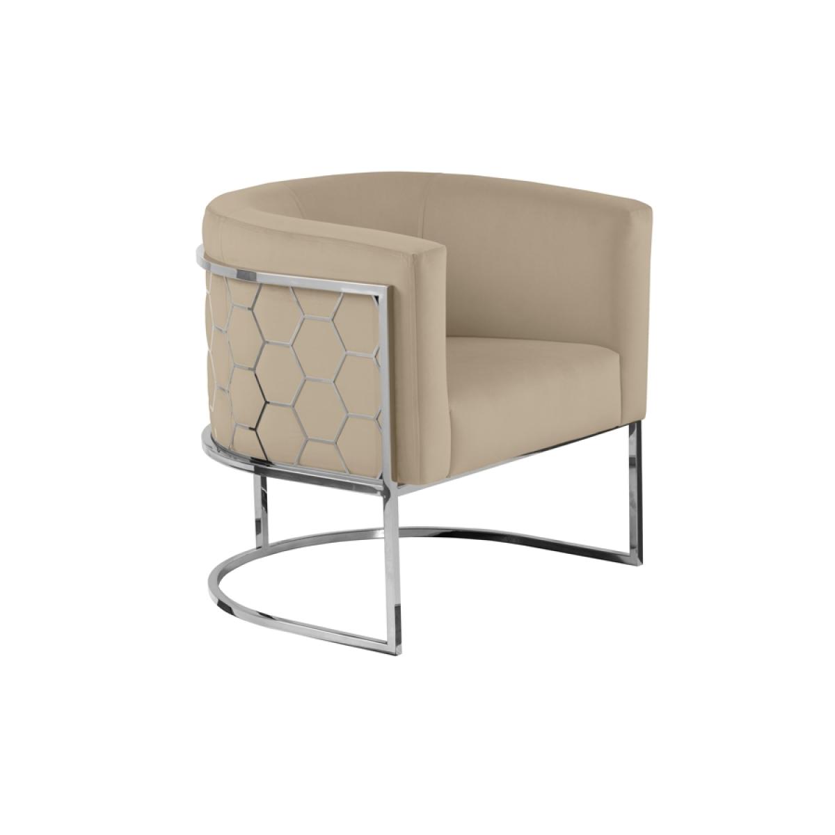 A unique and distinctive tub chair with laser cut hexagonal detailing. Inspired by highly collectable American mid-century furnishings. Steel frame with brushed chrome finish. Upholstered to order in the UK. Velvet fabric, available in a selection of colours. Can be upholstered in customers own fabric, subject to suitability. We recommend that customers request a free swatch of Fabric, to check the colour as on screen colour can vary. As this item is bespoke made, returns cannot be accepted due to the colour. Please E-mail or call for a swatch.