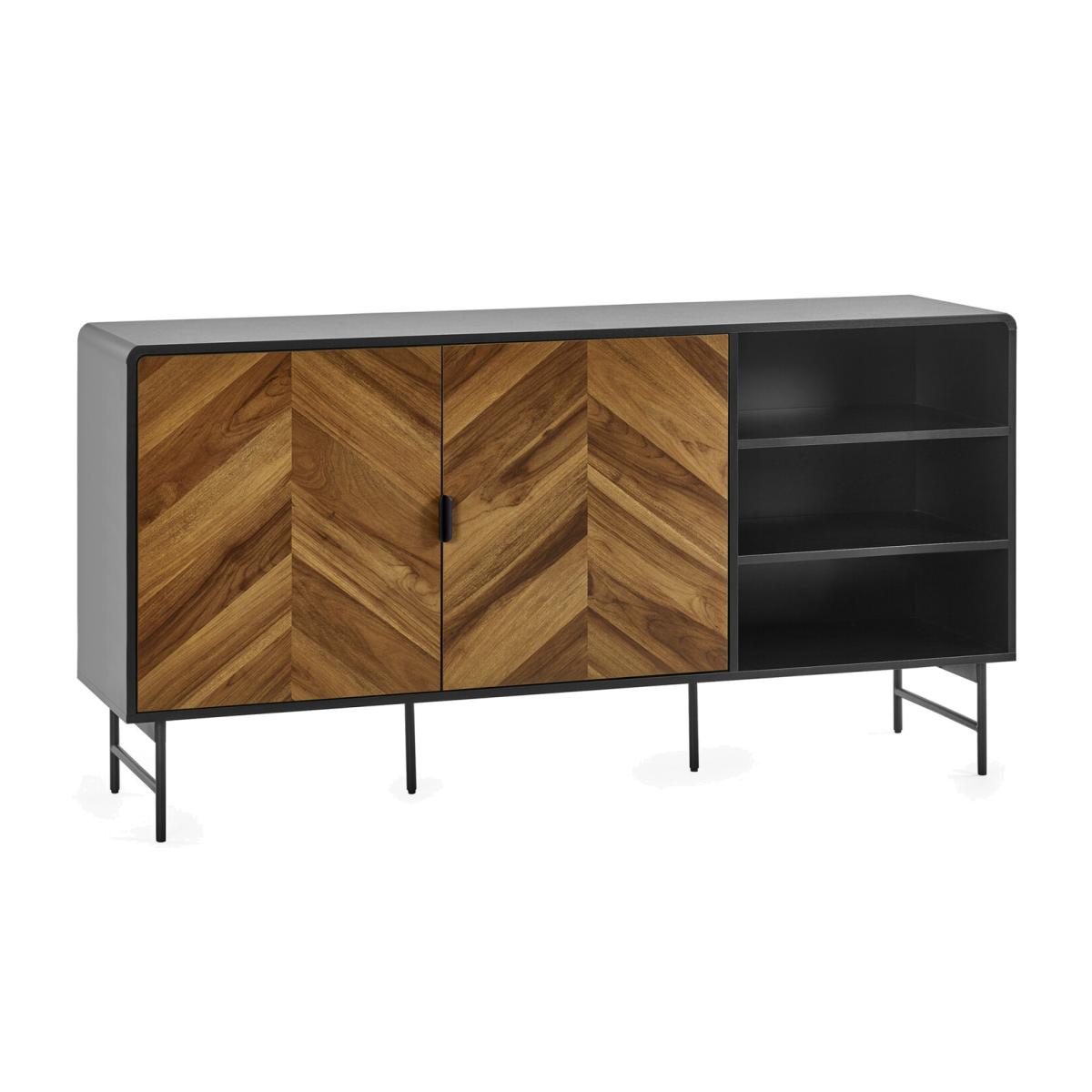 Make a statement with this striking sideboard, adding both style and smart storage to your space. The bold chevron warm wood-effect doors are framed by smooth curved edges and finished with sleek black edge handles for a refined look. Two open shelves offer easy access to display or store items, while the two doors open to reveal large shelves inside, providing generous hidden storage in this versatile cabinet. Supported by slim black metal legs, the piece feels light and airy, making it a perfect addition to living rooms, dining areas, or hallways. Self-assembly required.