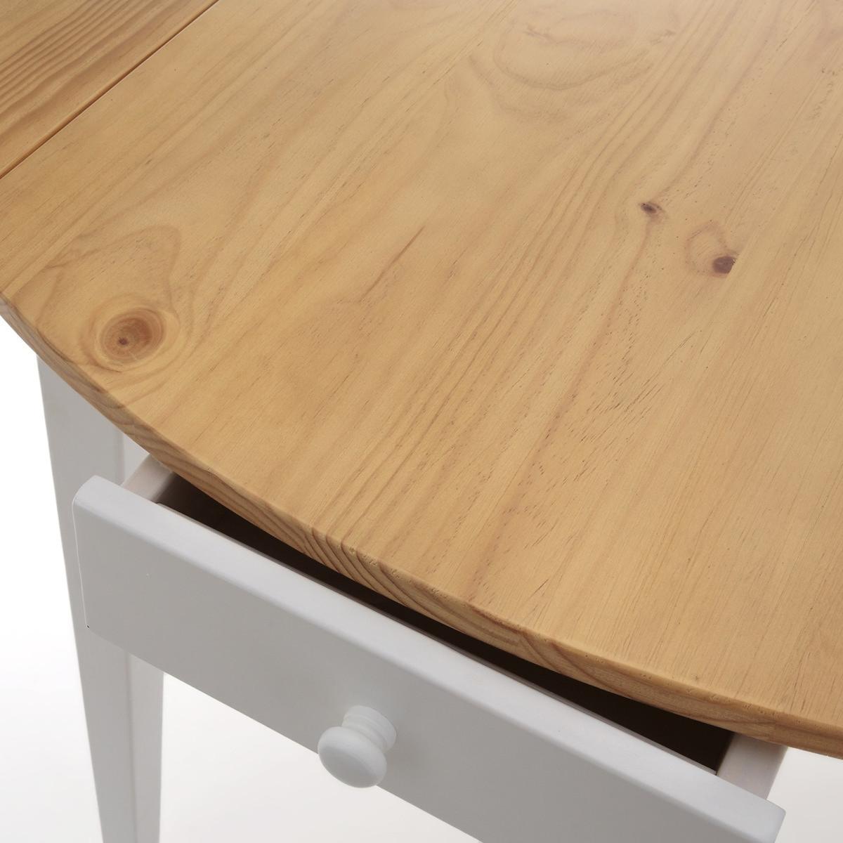 I love this table because of its versatile style, blending a natural wooden top with soft white legs that can seamlessly fit into both modern and traditional interiors. It works particularly well in Scandinavian-inspired schemes or coastal schemes, where light colours and natural finishes are key. Practical styling tips include keeping the tabletop clear for everyday use and adding a statement runner or placemats for special dinners. The drawers are handy for storing essentials like cutlery or napkins, helping to keep the surface clutter-free. For a cosy look, pair it with upholstered chairs or mix in some vintage accents for an eclectic vibe. The table's size and shape make it adaptable for smaller kitchens or open-plan living areas, making it a functional yet stylish choice.