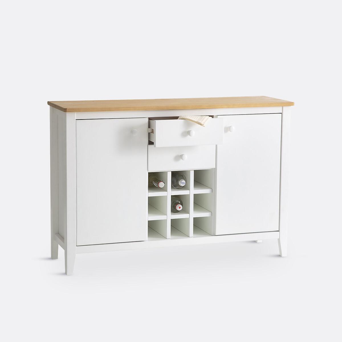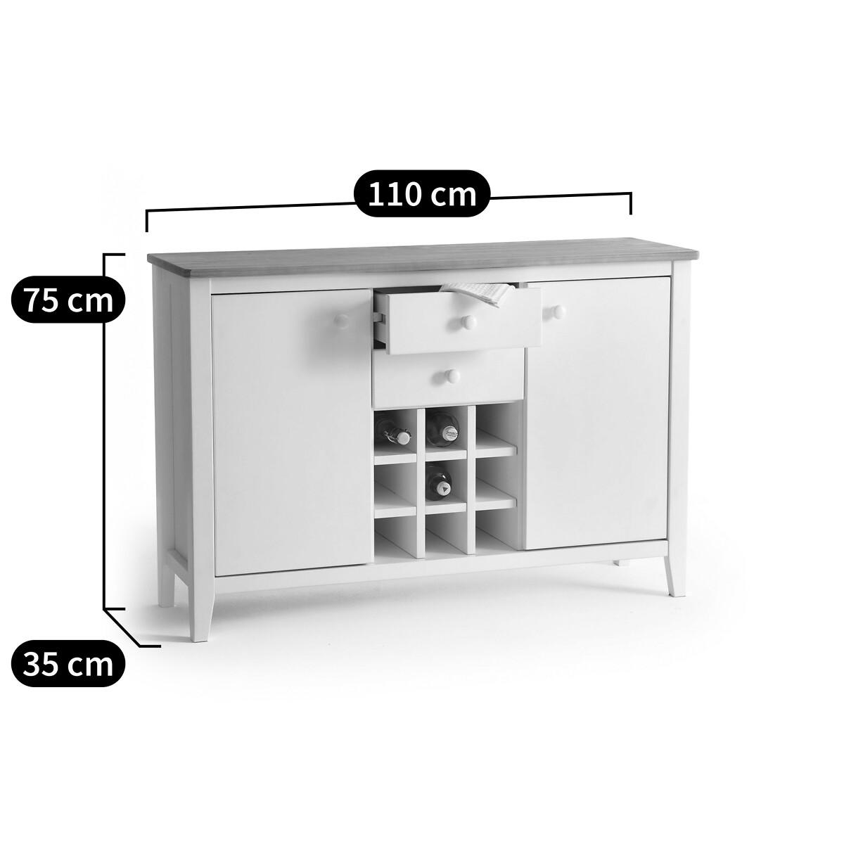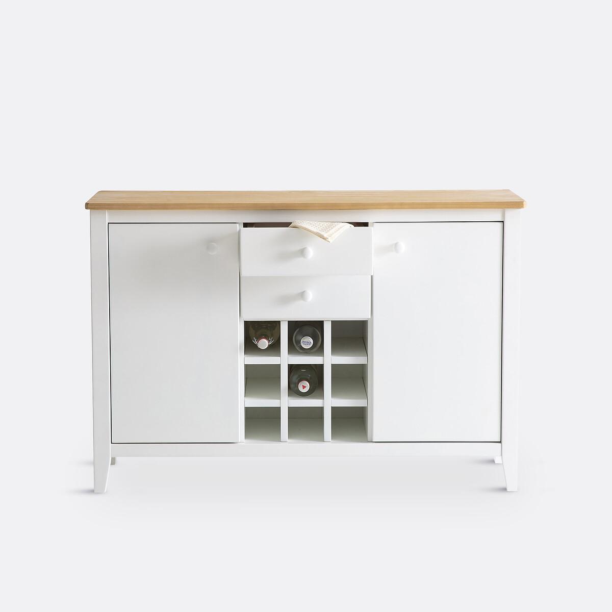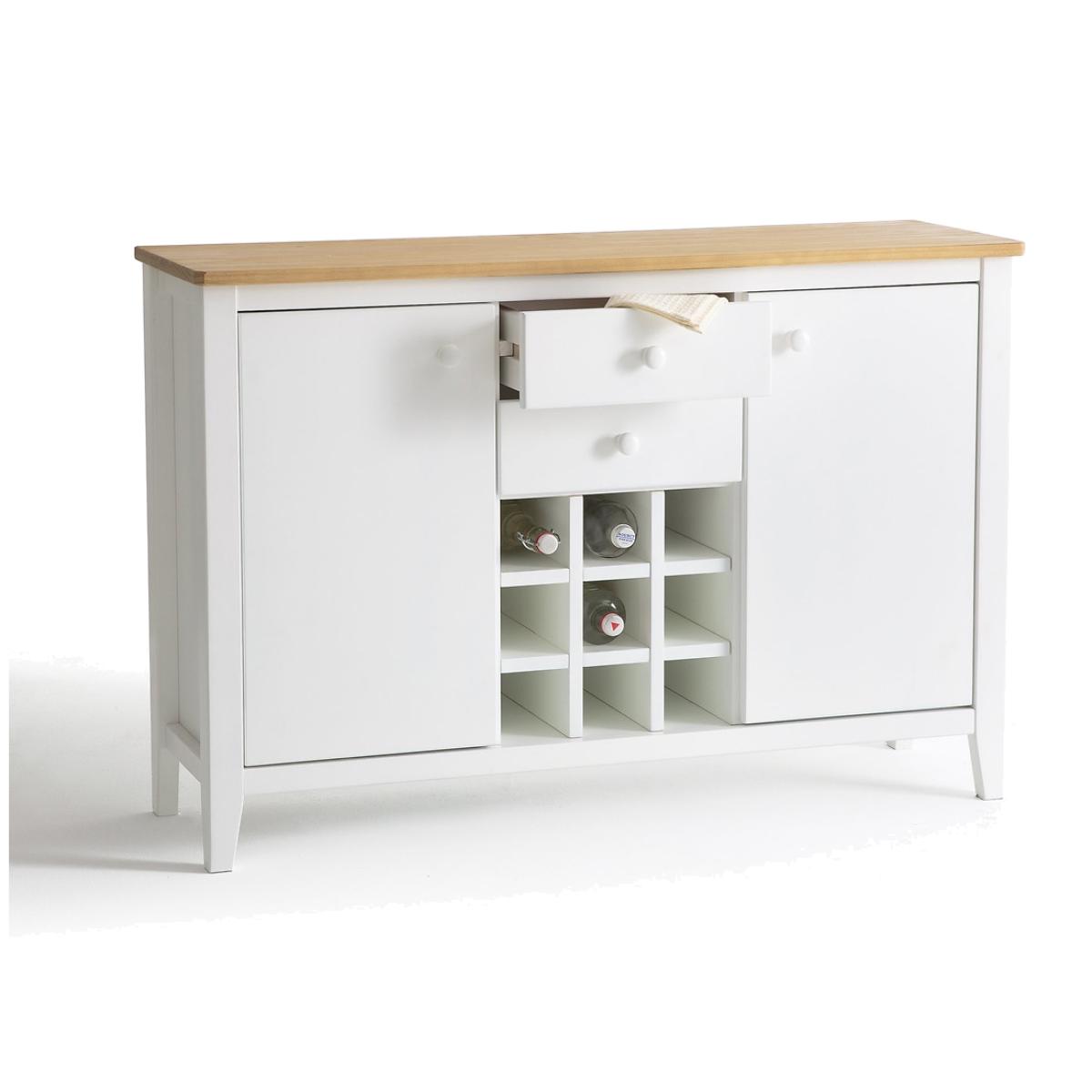 The Alvina sideboard. The space-saving piece of furniture is very practical in a kitchen with its 2 doors, 2 drawers and its bottle rack!Product Details • 2 cupboards, 2 drawers • Removable bottle rack that can be replaced with a shelf • Top and bottom in lightly brushed solid pine, oak stained, acrylic varnish finish. • Box and shelf in solid pine, white paint, acrylic finish. • Cardboard packaging and reinforcements, without polystyrene plates. Dimensions • Width: 110cm • Height: 75cm • Depth: 35cm • Internal dimensions of drawer:L26 x H8 x D24cm • 1 bottle storage: L9.5 x H9.5 x D28cm • Compartment behind door:L33 x H52 x D32cmDelivery:. Assembly required. Available for home delivery. • WOOD FROM MORE SUSTAINABLY MANAGED FORESTS AND CONTROLLED SOURCES. FSC® Mix wood contains at least 70% FSC® certified and/or recycled wood, the remainder being FSC® controlled wood. Dimensions and weight of parcel2 parcels • L121.6 x H11.6 x D43.1cm • L83.8 x H23.9 x D40.1cm • 45.6kg
