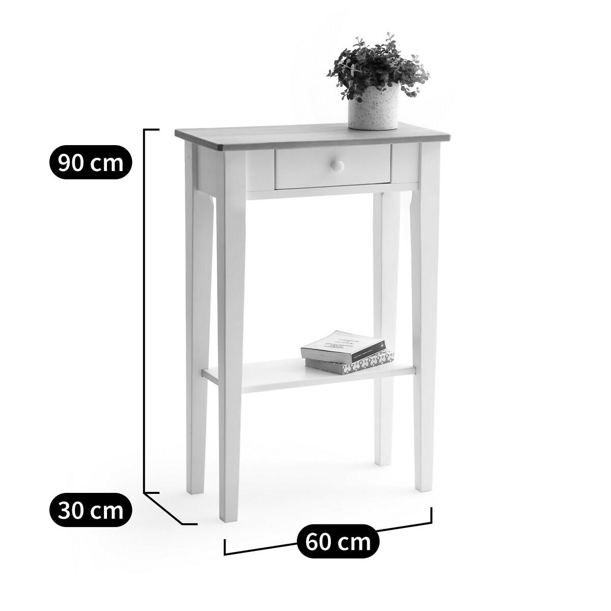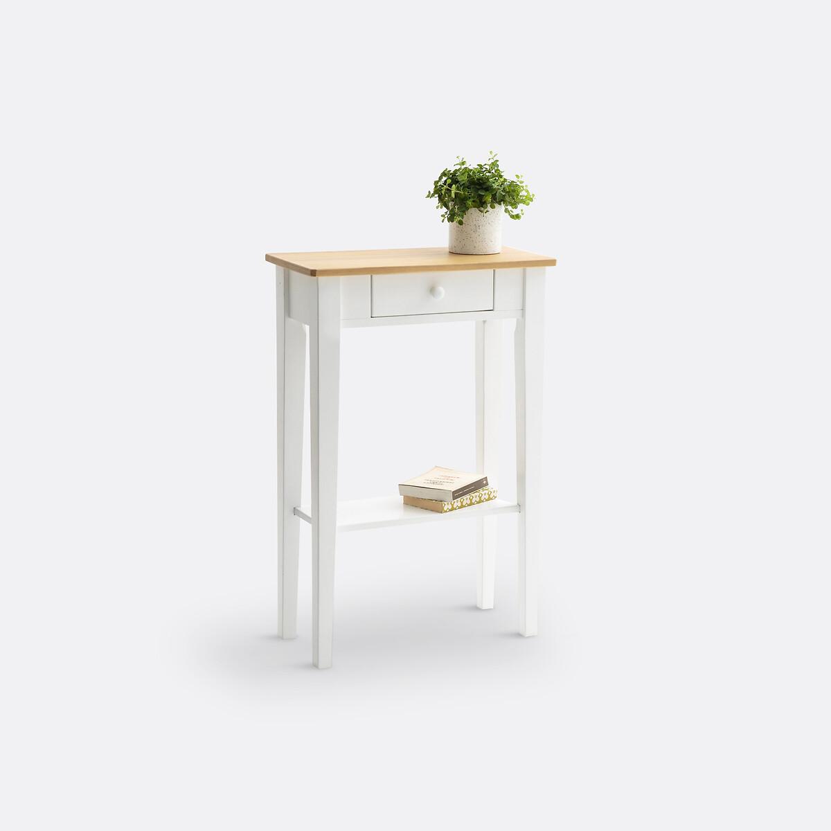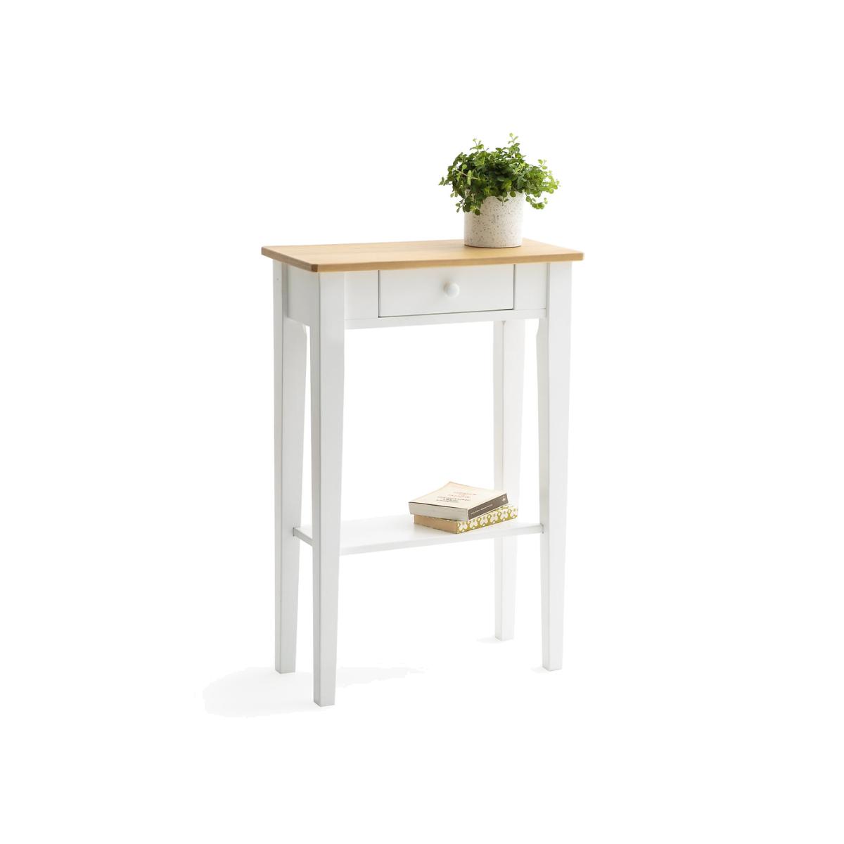 The Alvina console table with single drawer. Ever practical, whether in the bedroom or the hallway, this console table will look great wherever you put it!Product Details • Product Details: • 1 drawer • 1 shelf • Solid pine with stained oak acrylic varnish • Cardboard packaging and reinforcements, without polystyrene platesDimensions. Total: • Width: 60cm • Height: 90cm • Depth: 30cm. Useable drawer dimensions : • L25 x H6 x D16cmDelivery:. Assembly required. Available for home delivery. • WOOD FROM MORE SUSTAINABLY MANAGED FORESTS AND CONTROLLED SOURCES. FSC® Mix wood contains at least 70% FSC® certified and/or recycled wood, the remainder being FSC® controlled wood. Parcel dimensions and weight:1 parcel • L98.8 x H17.6 x D45.3cm • 16.7kg