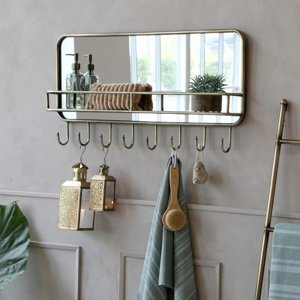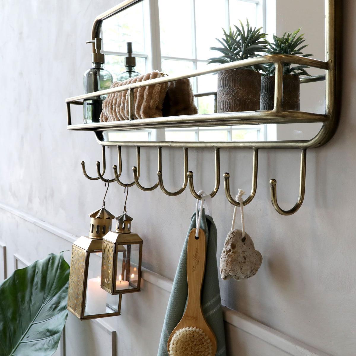 I love this mirror shelf with hooks for its versatile combination of practical storage and sleek design. It works well in both contemporary and eclectic interiors, offering a stylish way to keep everyday essentials close by-think keys, scarves, or small plants. Its clean lines and understated frame make it adaptable to hallways, bathrooms, or even bedrooms. For styling, consider grouping similar items on the shelf for visual cohesion, and hang coloured towels or accessories to add a pop of colour against the mirror’s reflective surface. It's a functional piece that helps keep clutter at bay while enhancing the overall aesthetic.